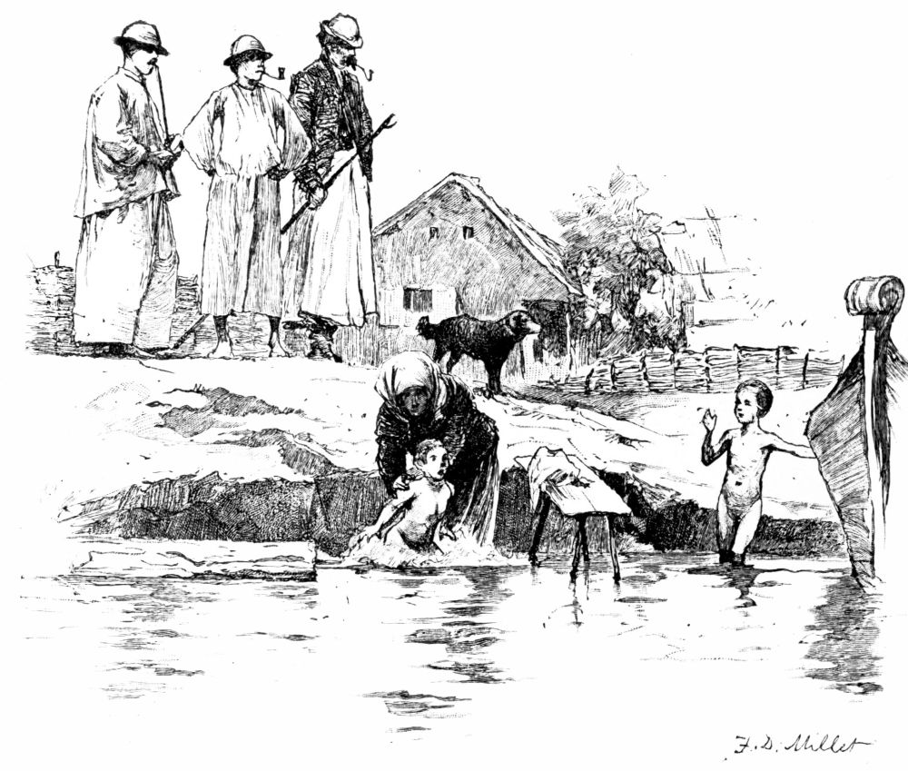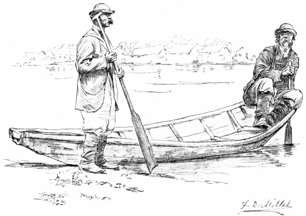 After our first introduction to real mud just below Belgrade, we had always looked forward to an ideal bivouac on a clean sandy beach on the shores of the Black Sea, where we should find drift-wood in abundance, firm smooth ground under our feet, and pure sweet air to breathe. We felt a certain elation, then, as we passed Kilia and saw before us a great flat, unbroken reed-covered marsh, in the belief that within a few hours we should probably reach this ideal camp and bid good-bye to Danube mud and its accompanying annoyances. We stole along in the shelter of a fringe of large willows on the Russian bank for about five miles. Through the trees we could see great vineyards and cultivated fields and occasional farm-houses. Peasants were at work repairing the low dikes that protect the farms from the overflow of the river, or weaving fresh rods in the wattled fences. We occasionally checked our speed to watch these operations, and if we had attempted to land would probably have been met with a prompt challenge, for all along at regular intervals the white uniforms of the sentinels could be distinguished among the undergrowth, and{309}