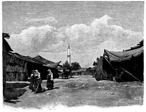 A hospitable-looking bath-house moored near the landing offered us a familiar refuge at Ismail, and we innocently put in there and prepared to go ashore. Before we had left the canoes, however, a fussy Custom-house guard with a short sword by his side came hurrying up, and peremptorily ordered us to cast off our painters and to land on a little beach about fifteen yards farther down-stream. We assured him we had the permission of the bath-house keeper to moor our canoes where we were, but he failed to see any point in this remark, and the more we demurred the more aggressive he became. Reinforcements now began to arrive and we thought best to yield, and consequently went ashore at the spot indicated. Just above, on the{300} bank, was a rambling wooden structure, offensively ornamental in style, somewhat resembling a sea-side villa. We were conducted into this building by our fuming guard and found it was the Custom-house of the port, although there was no sign nor flag to suggest this fact. Entering a small room, our passports were examined and stamped by a courteous official and given back to us again. Understanding that we were now free to go into the town, we returned to the canoes, took them up to the bath-house again, and, carrying our sketching materials, started to walk out through the enclosure in which the Custom-house was situated. We were not allowed to pass with our sketch-bags, and were conducted to the Custom-house to have them examined. Of course nothing dutiable was discovered in them, but we were told that we would not be allowed to carry them into the town until the chief of the customs had given us permission, and he was not expected at the office for an hour or more. There was nothing left for us but to wander off up the long street to see if there was anything worth sketching. It was an extremely hot day and the streets were dusty, unshaded by trees, and often almost impassable by reason of deep gullies and broken culverts. The town is laid out in rectangles, and most of the houses are long and low, and built of bricks or mud plastered on the outside; a few of them, however, are made of unpainted, skilfully-hewn logs. There are several large buildings on one side of the vast, empty square opposite the great white church with several green domes which rises high above the stunted trees and adjacent houses, but with these exceptions the street architecture, as far as we saw it, is of the plainest and least attractive kind.