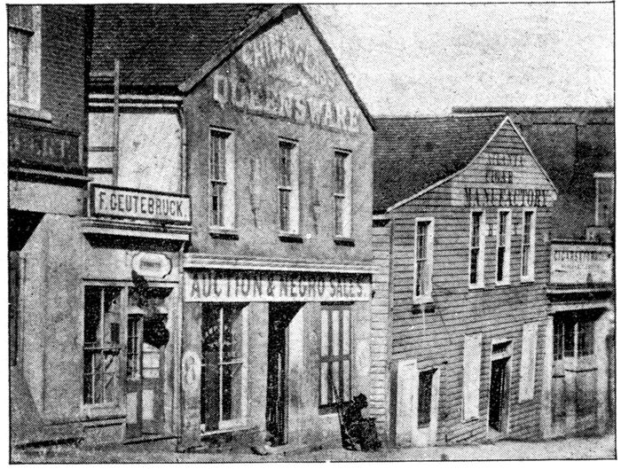 On their arrival at the place of destination, they were more or less jaded and warm, and hence unmarketable until properly fitted up. To facilitate this, buildings or “pens” were provided where they were well fed and given liberal rations of whiskey. Under the management of some genial dealer, they were induced to tell stories, sing songs and make merry. In this way they were soon recuperated and 16ready for the ordeals of another sale in which they were subjected to much the same scrutiny of body and limb that is bestowed upon a horse when the person would ascertain its physical condition.