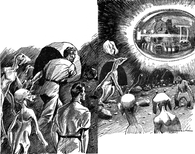 Kueelo, I found, was sullen and silent. The other Martian, V'Narik, talked to me only on a few occasions. "I have a curious presentiment," he told me once, "that I shall never escape from here. You others, perhaps, but not me. I am with you on this only because there is nothing better to do. But if I can only reach the surface, and glimpse the stars once again—especially the redness of Mars—this will have been worth while."