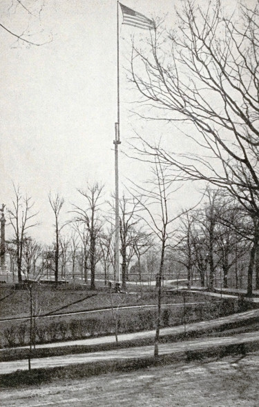 In front of the library a platform is raised, and draped with the star-spangled banner, and a canvas canopy stretches across from tree to tree. Strong ropes wall in the space below, where stand the chairs, rank after rank, and as the morning hours run on, sentinels guard the ropes against all intruders. The seats, of course, are, first of all, for cadets and people of the Post, but just there does the dear general public wish to sit, and for whom the chairs are placed affects them not at all. So, for an hour or more, there is a sort of running fight—a skirmish line—all round the lines of rope, and the sentries well nigh meet their match. Demands, complaints, exclamations, are loud-voiced and many, and neither orders nor fixed bayonets win much respect.