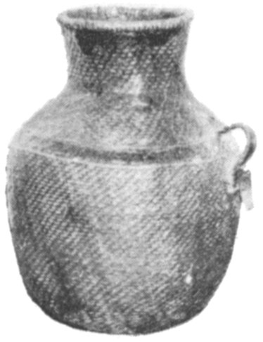 These large Apache baskets used for storing grain, were made about 1874. It required as long as three months to produce this type of specimen and since 1914 very few have been made. The twenty-five cent burlap sack has replaced it. (See Plate 6c)