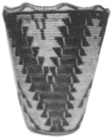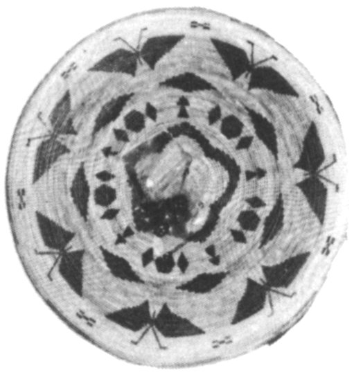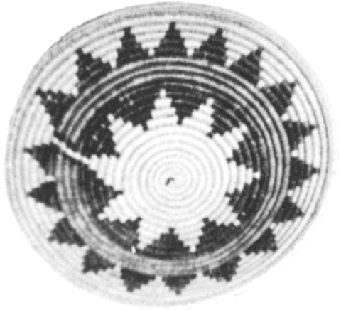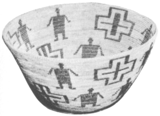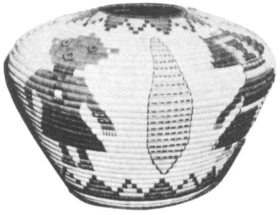 The identification of a basket is made not through the interpretation of a “mysterious meaning” of the design but generally from the design motif itself. For instance, baskets made by tribes of southern California are distinguishable to the trained eye since they tend to be of a particularly heavy, bold and angular style. They seldom have mysterious meanings! (See Plate 12b)