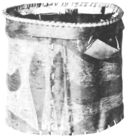 These tightly woven baskets made by Thlinkits of Alaska, were woven from spruce tree roots which were split by hand. The baskets were used to hold boiling water for clam cooking. The fibers swelled to such an extent that water could be retained in the basket for as long as five hours. Today this tribe purchases a kettle or bucket for their boiling needs. (See Plate 9c)