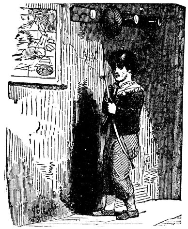 The same evening, when it was dark and cold, another little boy left his home. It was no nice cheerful home, like Robert’s, with warm fires, and bright lights. It was one small room, and in the grate only a few cinders. On a bed of straw in a corner his mother lay very ill. As he went out, he said, “Mother, try to sleep; I will not be late coming back.” He worked in a factory not far off, and it being Saturday night, {6}he knew he would not be kept late. As he was coming home, weary and cold, thinking of his poor mother, and how he would like to take something that would do her good, his eye rested on some beautiful fruit at a shop-door outside the shop. He saw that no one was near; he could touch them in passing. The temptation was too great—the little fellow quickly put three lovely apples into his pocket, and ran down the street. When he got to the lamp-post at the corner, he took out the apples and looked at them. “They will make my mother well, perhaps; but then, are they mine to give her? I could easily make her think a lady gave them to me; but God would know.” Then, looking at them again, he said aloud, “Thou God seest me! That is my Sabbath-school ticket for to-morrow. No, mother must not have them. I cannot sin against God.”