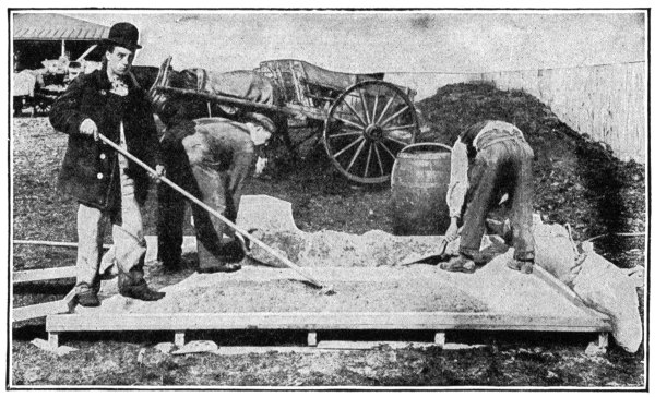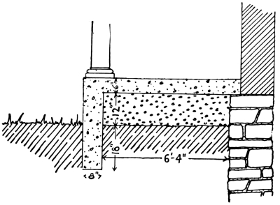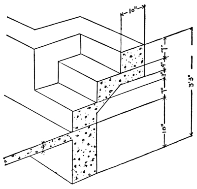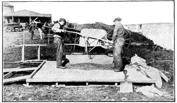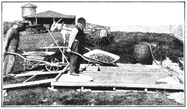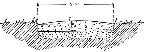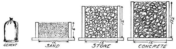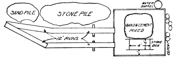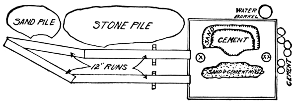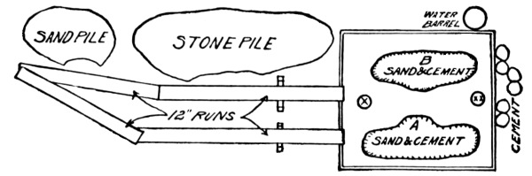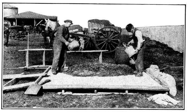 The materials required are: screened gravel or crushed rock, 4½ cubic yards; sand, 2¼ cubic yards; and Portland cement, 7½ barrels. [Pg 108]