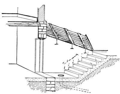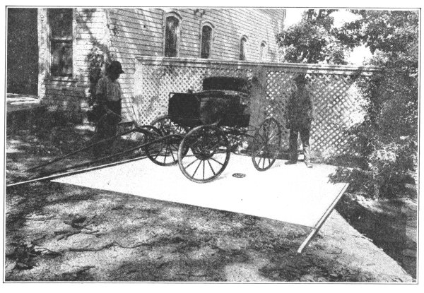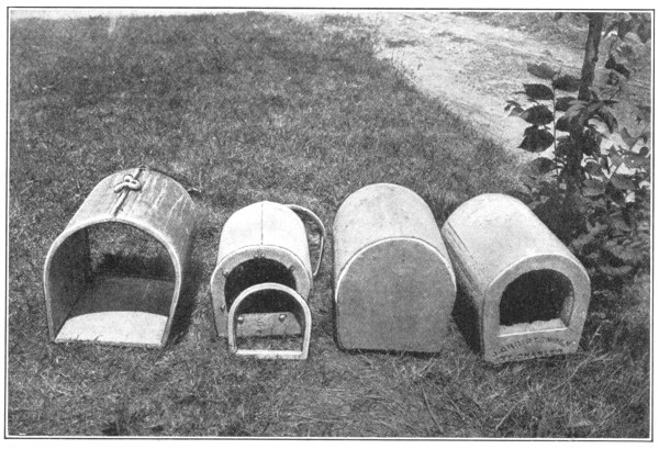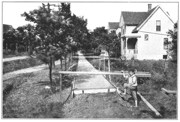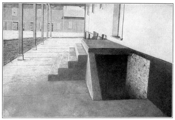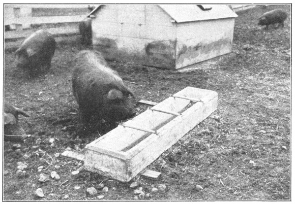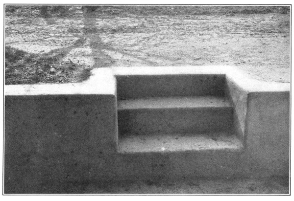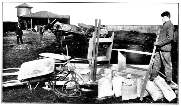 Hitching posts, made in a slightly larger box form, with a bolt and ring inserted in the concrete before it has hardened, add neatness to the house surroundings. Gate posts of concrete, nothing more than heavy fence posts made long enough to take the highest fence, prevent sagging gates, so hard to open. A concrete clothes post is ready for the clothes line and the wash every Monday morning. The weight of the wet clothes does not break them down or cause them to sag. Clothes never have to be rewashed due to dragging in the dirt. [Pg 105]