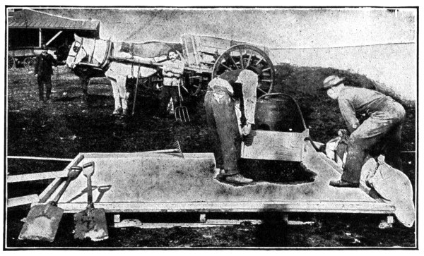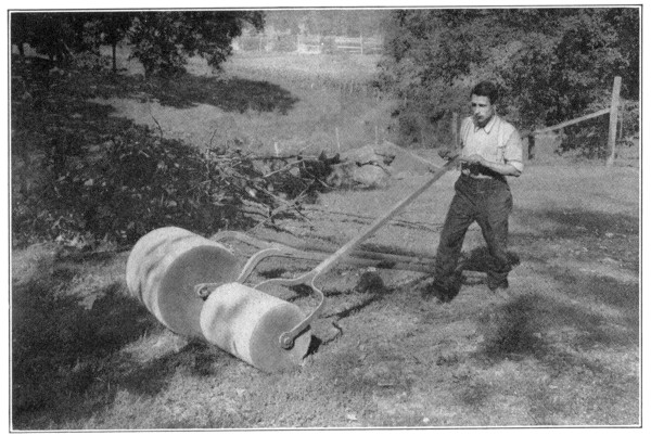 Obtain a length of sewer pipe, of the size of roller wished for. A tile from 12 to 24 inches in diameter will usually suit the purpose. Set this tile on end, small end down, on a wooden platform. Through a hole bored in the platform insert a 1-inch round iron bar, long enough to project beyond the ends of the roller a sufficient distance to provide bearings and attachment for the handles. Care should be taken to get the bar exactly in the center of the tile before placing concrete, and to keep it there while the concrete is being placed. Make a wet mixture of concrete (1: 2: 4), and fill the tile with this mixture, up to the “bell” of the tile. Allow the concrete to set for ten days, when the roller may be placed on side, and the bell of pipe chipped off with a cold chisel and hammer. Attach a forked handle, as shown in the illustration. As the axle is a firmly-fixed part of the roller, the fork ends of the handle must be provided with holes, within which the axle can turn.