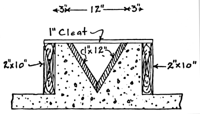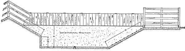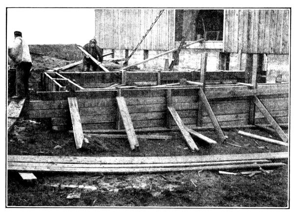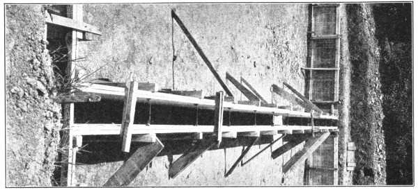 To prevent the material of which the road is made from washing down into [Pg 109] the culvert, small wing or retaining walls must be built at each end. To do this dig an 8-inch trench 3 feet deep, at each end of the culvert along the end of the culvert barrel. Frame a form, the width and height necessary, against the end of the box or pipe. Make another form, of the same size, but U-shaped, with the opening just large enough to fit over the outside of the concrete culvert barrel. Set this form 8 inches inside the first. Plumb both forms and brace them securely. Nail boards across the ends of these two forms and fill them with concrete. For one week shut off the traffic from passing over the culvert. Allow the forms to remain in place for two weeks. Replace the road material over the culvert and keep the ruts carefully filled until the fill has become solid. Since there are usually many culverts to be built, it is cheaper to use a collapsible form, adjustable to several sized culverts.