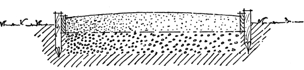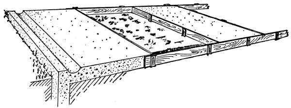The best time to build a culvert is in the dry months of summer. They can be shaped either round or square and of a size depending on the amount of water which must be removed quickly. Usually openings 12 to 18 inches are large enough. Set the culvert as deep in the road bed as possible, but do not place the outlet end lower than the bottom of the ditch into which the culvert drains. To keep the culvert well beneath the road bed, if necessary, make the side ditch deeper at the inlet end. Determine the grade line of the finished culvert bottom. Only a little slope is needed. Dig the trench 6 inches deeper than the grade line and as wide and long as necessary. The width of the trench depends upon the size of the culvert to be built, and its length upon the width of roadway under which the water is to be carried. The concrete walls are each 6 inches thick, so the width of the trench will be 1 foot greater than the clear width of the culvert. Fill this trench with concrete mixed 1: 2½: 5, and, while it is still wet place in the center of it a U-shaped box, turned upside down, of 1-inch boards, the outside of which is the size of the culvert desired. Fill concrete into the space between the sides of the box and the sides of the trench and tamp concrete over the top to a depth of 8 inches. Road culverts should not be less than 18 inches below the surface of the roadway.