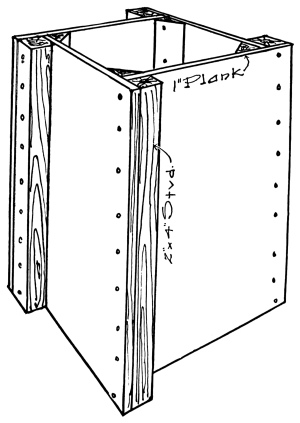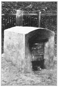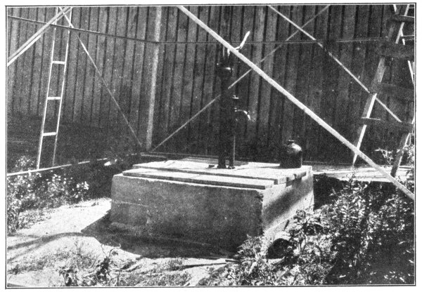 Dig out the dirt to the depth of 6 inches. For forms choose two barrels, one of which will set within the other with a clearance on all sides of 6 inches. Adjust the height by cutting off their butts. Make an opening through which a metal ash box can be inserted or over which an iron door can be hung. Fill the foundation hole and the forms with 1: 2: 4 concrete. Remove the outside form after two weeks. The fire will later take care of the inner form. After three weeks the burner may be used. [Pg 104]