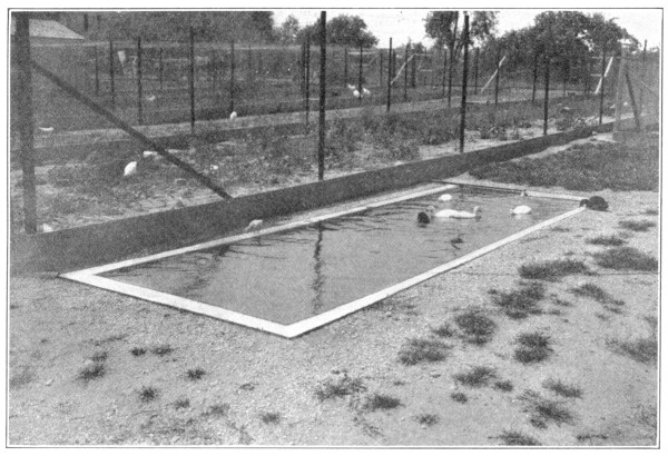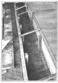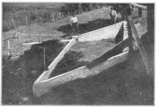Erect the forms for the tank proper as for Watering Tanks, page 74. In the bottom of each tank set a 1½-inch flange pipe coupling. Place 1 inch of concrete, then strips of heavy woven wire, and the remaining 3 inches of concrete. Fill the side walls and, 1 inch from the outside, imbed similar wire fencing. Protect the green concrete according to directions under watering tanks.