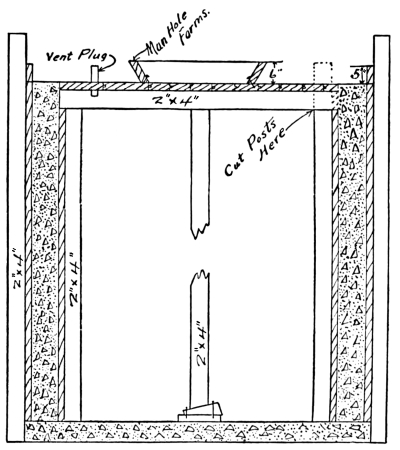 Before filling the forms, set in the 6-inch inlet and outlet drains at the same height, 2 feet 6 inches below the ground level. To aid further in breaking up the currents and keeping out too much air, use elbow bends, so that the sewage in the tank will cover the mouths of the tile. In the side forms, at a distance of 2 and 4 feet from the inlet wall, set ¾-inch bolts to which the baffle boards will later be attached. These boards reach entirely across the tank, project above the sewage, and extend to within 1 foot of the bottom. While building the manhole covers, for the needed ventilation, insert in them four short lengths of 1-inch gas pipe.