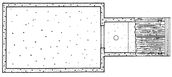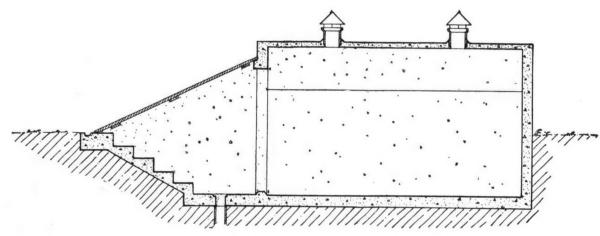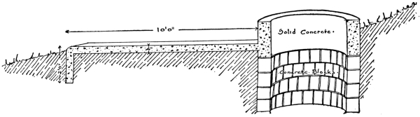 Locate the septic tank where it can be placed entirely with the side walls underground and out of danger of flood waters. For a family of 8 to 10, plan a tank with 8-inch walls, 5 feet wide, 5 feet deep and 10 feet long—all dimensions in the clear. Lay out the tank and construct it in exactly the same manner as Underground Cisterns, page 68.