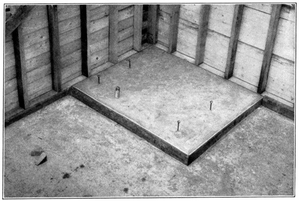 While placing the last foot of concrete, imbed a harrow tooth, iron bolt, or gas pipe, with its top just showing above the finished concrete at a point directly under where the strings cross. Protect the monument from damage by stock for one week, by placing a box over it.