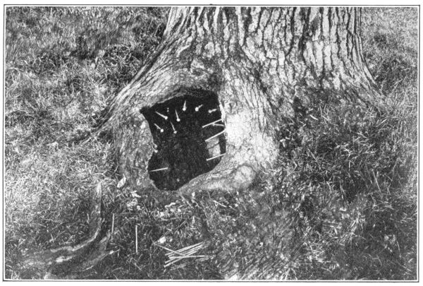 By means of concrete, many famous old trees, seemingly about gone, are now saved. Open up the cavity with a hand-axe. With a mallet and chisel cut out every bit of the rotten wood, and stop the flow of sap by painting the cavity with liquid asphalt. Reinforce small cavities with nails as shown in the photograph, larger cavities with rods, wire and spikes. Carefully fill every crevice with a 1: 3 cement-sand mortar. By slightly trimming the edges of the bark around the filling, once or twice a season, the bark will grow entirely over the concrete. [Pg 102]