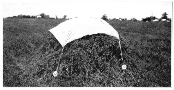 With the usual shortage of labor in the harvest season and the frequent occurrence of showers, to secure sweet, unmolded hay it has become necessary to cover the hay cocks with a canvas or muslin cover. The best weights to hold down the covers are made of concrete. Mix the concrete 1 part Portland cement to 2 parts sand, mold them like doughnuts or as cakes with a galvanized wire loop, and set them aside in a damp place for 7 days before using.