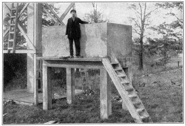 Locate the tank convenient to the water supply. Dig the column holes 12 inches square, 3 feet deep, 11 feet out to out on the longer side and 5 feet on the shorter. Have all forms ready before placing any concrete. Fill the holes with concrete and imbed in each hole four ½-inch iron rods 10 feet long so that they will come right for the columns and extend through them. Set up the 10 by 12-inch by 6-foot column forms with their tops level with each other. Join them together with the solidly framed 8 by 12-inch beam forms.
