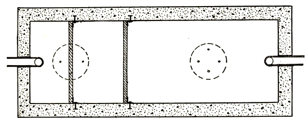 Septic tanks are nothing but long underground, water-tight cisterns through which the sewage passes very slowly and evenly. Located underground, they are warm and dark—ideal conditions for the [Pg 111] development of the bacteria, little germs which eat up the sewage and render it harmless in much the same way as another kind causes cider to ferment. To prevent the bacteria (which live in the frothy sludge) from being disturbed cross-walls, called baffle boards, are placed to break up the current of the inflowing sewage. The purified sewage, merely clear water, may be discharged into the farm drain tile.