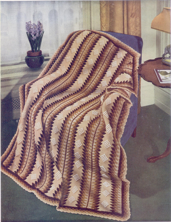 Spread a pad (on a table or on the floor) on which the afghan can be stretched and pinned. Having wrong side up, pin afghan on pad (using rustproof pins) about every inch, stretching it to the given measurements. Lay a damp cloth over it, pass a hot iron lightly over the cloth allowing the steam to go through the material but do not let the weight of the iron rest or press on it. Leave afghan pinned down until dry.