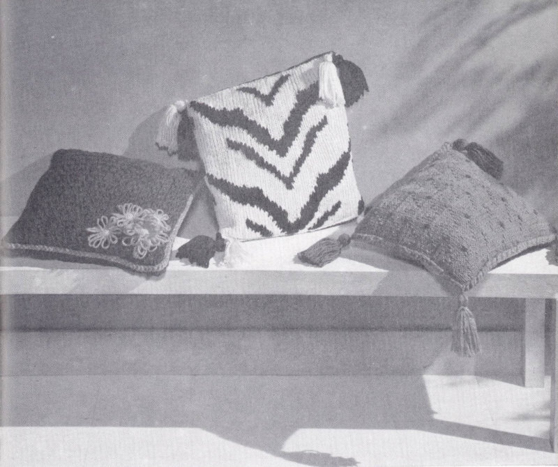 FINISHING: Block to measurements. Fold lining material in half. Sew 2 side seams allowing ½ inch on each side for seam. Turn inside out and fill with shredded foam rubber or Cotton, sew top seam. Sew knitted section on front of pillow with “STAR” MERCERIZED SEWING THREAD.