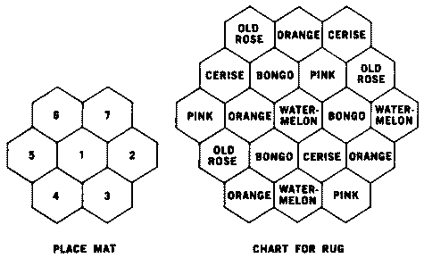 Work 19 groups same as place mats having 3 of Old Rose, 4 of Orange, 3 of Cerise, 3 of Bongo, 3 of Pink, and 3 of Watermelon. Arrange motifs according to chart on page 12. Sew groups tog in back loop of sts.