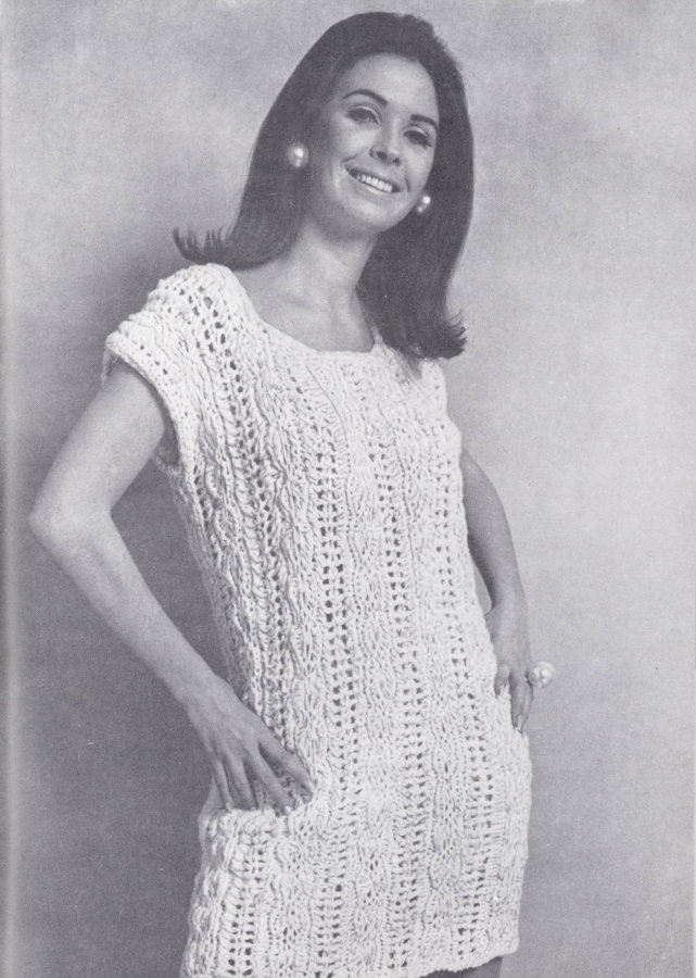 BACK: Cast on 63 sts. 1st ROW: P across. 2nd ROW: K 2, * y o, K 2 tog through back, P 1, K 3, P 1, K 2 tog from front, y o, P 1, repeat from * 4 times, y o, K 2 tog through back, P 1, K 3, P 1, K 2 tog from front, y o, K 2. 3rd ROW: P 4, * K 1, P 3, K 1, P 5, repeat from * 4 times ending K 1, P 3, K 1, P 4. 4th ROW: Repeat 2nd row. 5th ROW: Repeat 3rd row. 6th ROW: Repeat 2nd row. 7th ROW: Repeat 3rd row. 8th ROW: K 2, * y o, K 2 tog through back, P 1, K 1, let next st drop 5 rows, pick up and K dropped st working over all dropped rows, K 1, P 1, K 2 tog from front, y o, P 1, repeat from * 4 times, y o, K 2 tog through back, P 1, K 1, let next st drop 5 rows, pick up and K dropped st working over all dropped rows, K 1, P 1, K 2 tog from front, y o, K 2. Repeat from 1st to 8th row for pattern until there are 13 patterns. Place markers for underarms, then work 4 more patterns. Bind off.