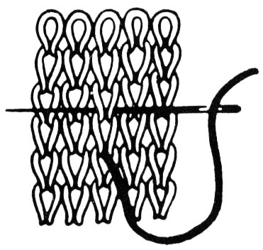 This is the stitch used most often for embroidering a desired motif on a knitted article. It is worked by: * bringing needle through center of stitch from the wrong side to right side of work—see ill. A. Following the outline of the knit stitch above, draw the yarn across the back of the two strands of this stitch—see ill. A and B—return needle to the center of the same stitch—see ill. B—and draw yarn through. Repeat from * starting next stitch by bringing needle through center of stitch to be duplicated—see ill. C.