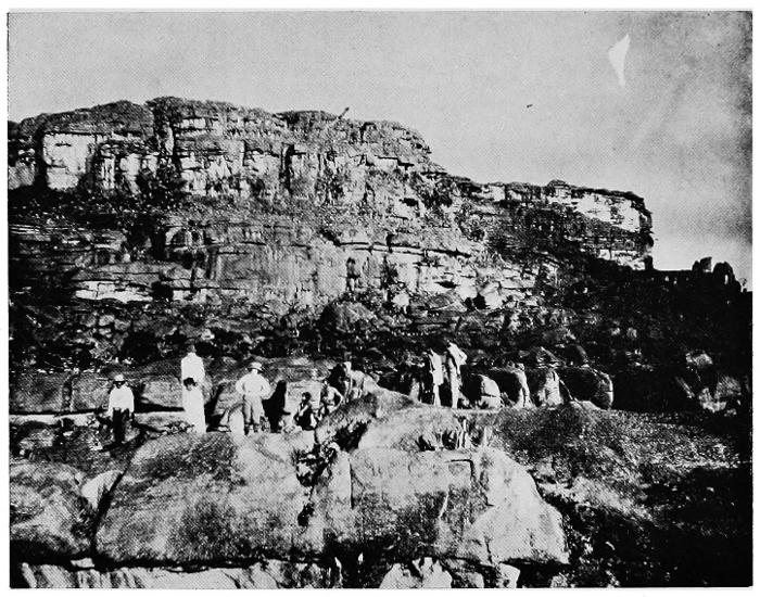 It was rather an uncomfortable position. We had about thirty very hungry people with us. They had been reckless with the food-supplies; and, when Mr. Menzies remonstrated, Joseph had[190] declared: “Arekuna, plenty cassava.” But at the “breakfast” hour this day more than half of our followers had had nothing to eat. We resolved, therefore, to establish ourselves at Kamaiwâwong as comfortably as possible for the night, and on the morrow, if the Arekunas did not return, as we hoped they would do, to send out a raiding party to find their provision-fields and to bring in cassava, whilst we, with another party, would attempt to make our way up the mountain. With field-glasses we could see quite clearly, running up the cliff-face, the ledge by which all ascents of Mount Roraima have been made since Sir Everard im Thurn first found the way in 1884, a line of green across the red face of the rock.