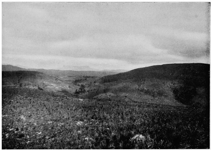 From the ridge above the head-waters of the Chitu we descended gently, and after fifteen minutes’ march we forded the Maipa, a deep, sluggish stream, with a belt of forest at its farther side. On the projecting branch of a tree a glorious purple orchid, the only one we saw during our journey, was admiring its reflection in the water. The Maipa probably belongs to the Orinoco watershed. We then traversed the narrow forest belt on the farther bank, and emerged into a curiously-rifted savannah, which led us to the foot of another abrupt hill-side. Up it we went, and found ourselves at the edge of a vast rolling plain, Weitipu on our right and far beyond a big fog-bank, which we knew concealed[184] Roraima. His great form loomed dark in the cloud. This tableland, at the extreme south-east edge of which we stood, extends past the foot of Mount Weitipu almost to the foot of Roraima, and then drops down to the Kukenaam River. Its average level is fully 3,800 feet above the sea, its gentle grassy undulations, broken here and there by clumps of trees beside intersecting watercourses, spread out before us for a distance which it took no less than five and a half hours’ actual march to traverse. This plateau is a superb pasture-land, but no animals now graze there, save a few wild deer. What a country to lie fallow!