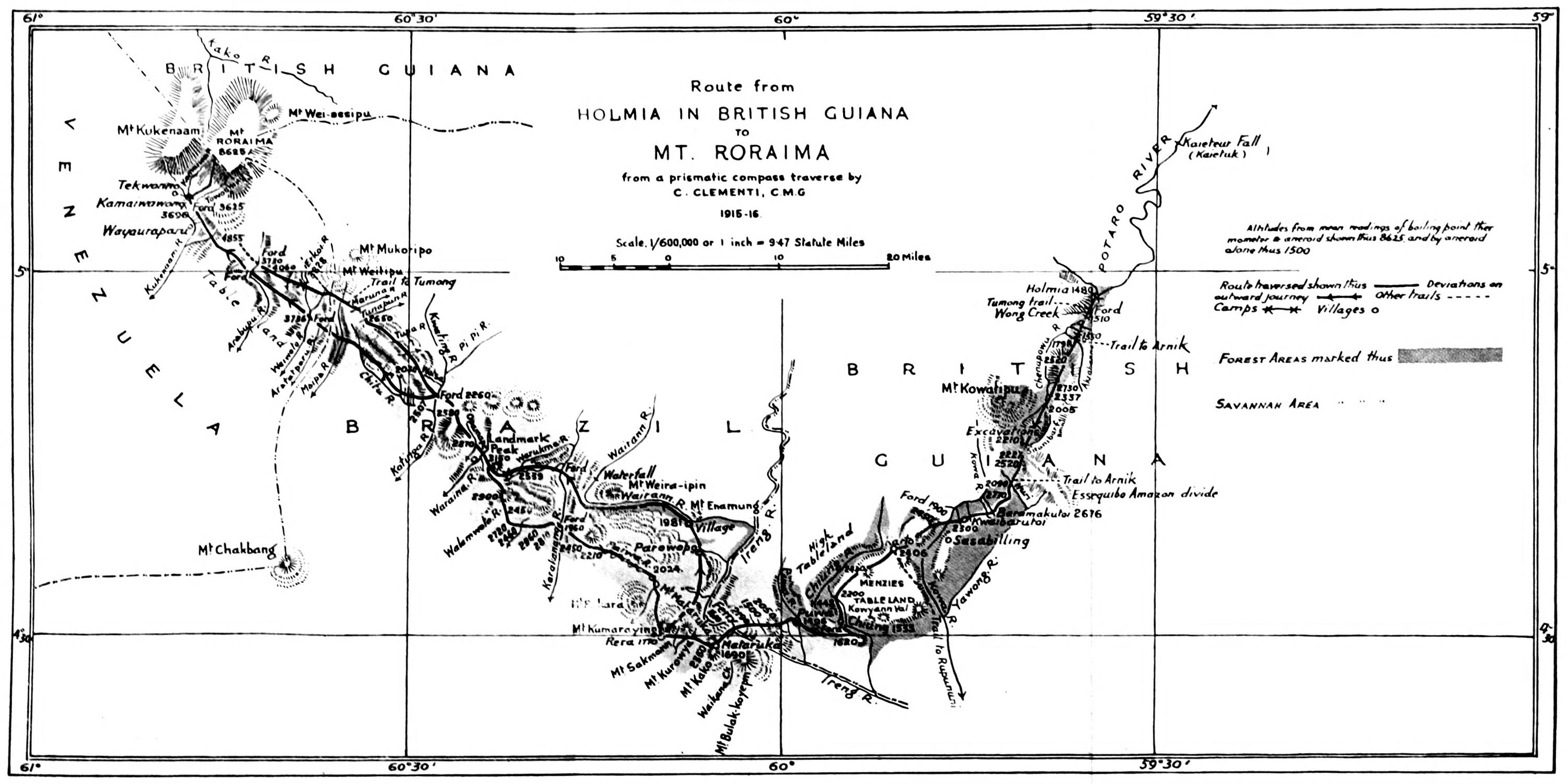 Two long years my husband and I lived continuously[14] in Georgetown, at the mouth of the Demerara River. Then, exhausted in mind and body by the enervating atmosphere and dismal monotony of a tropical coast, near the equator and below sea-level, we decided to spend a brief holiday in exploring a part of the Colony’s interior hitherto blank upon the map, hoping to find there some of that strength which cometh from the hills. A journey up cataract-barred rivers and through primeval forests by Indian trails was in itself an attractive prospect; but we had a still more potent lure. On the 21st March, 1914, my husband had spent a day at the Kaietuk Fall, and had gazed from the brink of the great chasm into which the Potaro River there plunges, up its dreamy reaches towards the forest-clad ridges that stand above the Arnik creek and away to the towering, cliff-faced mass of Mount Kowatipu. It was then that he resolved to visit some day the wonders which Nature might hold in the forests and savannahs farther to the west and the south-west, and perhaps even to make his way to that famous Mount Roraima, of which the residents in British Guiana hear so much and see so little. Then, in October, 1915, he made the acquaintance of Mr. J. C. Menzies, whose[15] occupation as a diamond and gold prospector had carried him into distant parts of our Colony’s interior. Mr. Menzies’ account of prairie tablelands at high altitudes, to be reached by travelling a few days beyond Kaietuk, and affording a view of Mount Roraima, where the boundaries of British Guiana, Brazil, and Venezuela meet, and whence streams flow to the Amazon, Orinoco, and Essequebo, determined us to attempt the journey across those tablelands to that mountain of mystery. During the previous seven years Mr. Menzies had frequently traversed the little-known and unsurveyed part of the Colony that lies between the Potaro River and our frontier with Brazil, and he had been greatly struck by the opportunities for cattle-ranching afforded on its highland savannahs. He had, moreover, bought and driven cattle from Brazil over the Ireng River into British territory, where they wander freely under the nominal guardianship of a tribe of Makusi Indians. He was therefore well qualified to make the preliminary arrangements for the expedition which we had in mind, and he very kindly agreed to place his experience unreservedly at our disposal and to accompany us. His knowledge of our proposed route did[16] not extend beyond the Colony’s boundaries; but he felt sure that an Indian guide could be found in one of the villages near the Ireng, who would be able to lead us on to the goal of our hopes, Mount Roraima.