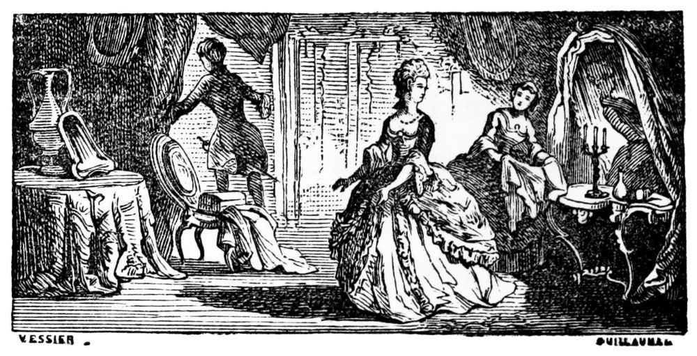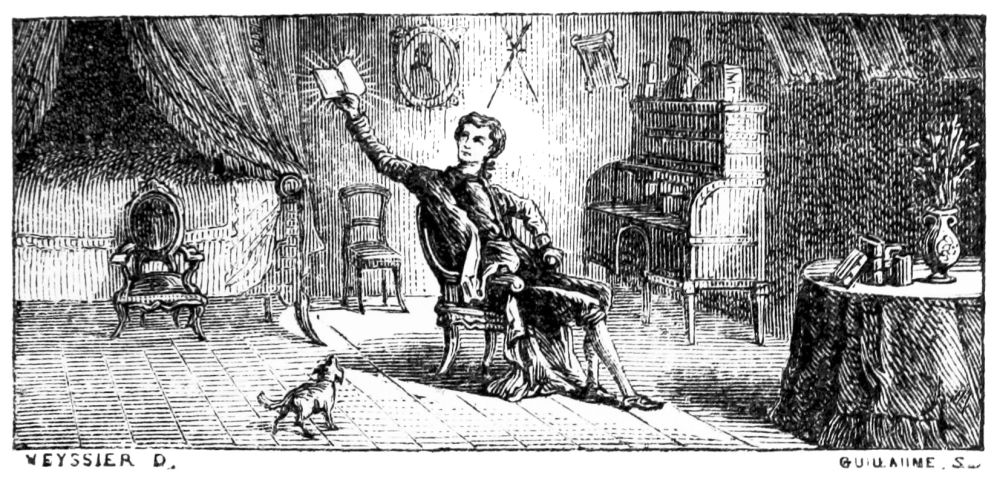 I worked myself, at last, into a state which it would be hard to describe, while my soul, either sagaciously or by chance, hit upon a way of escaping from the gauzes by which it was being suffocated. I know{123} not whether she discovered an outlet, or whether, which is a more natural conclusion, it occurred to her to raise them: at all events, she found a means of egress from the labyrinth. The tresses of disheveled hair were still there; but they were now rather help than hindrance; my soul seized them, as a drowning man clutches the sedge on a river’s bank, but the pearl necklace broke in the act, and the unstrung pearls rolled on the sofa, and from the sofa to Madame Hautcastel’s floor (for my soul, by an eccentricity for which it would be difficult to give a reason, fancied she was at that lady’s house); then a great bunch of violets fell to the ground, and my soul, which then awoke, returned home, bringing with her common sense and reality. She strongly disapproved, as you will readily imagine, of all that had passed in her absence; and here it is that the dialogue begins which forms the subject of this chapter.{124}