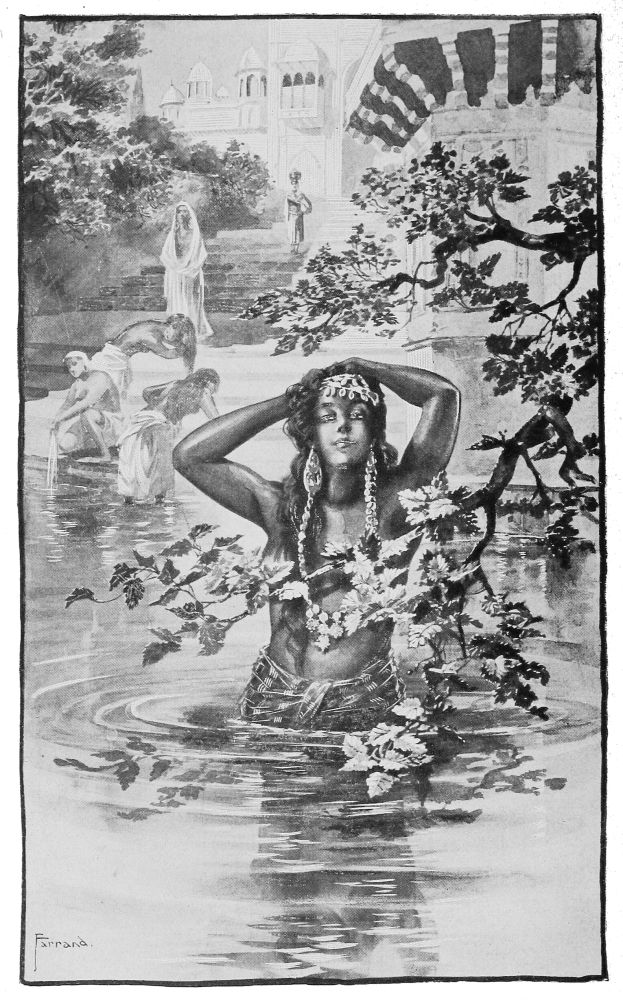 FROM the Cotton Press the Englishman wandered through the wide streets till he came into a Hindu Temple—rich in marble, stone and inlay, and a deep and tranquil silence, close to the Public Library of the State. The brazen bull was hung with flowers, and men were burning the evening incense before Mahadeo, while those who had prayed their prayer, beat upon the bells hanging from the roof and passed out, secure in the knowledge that the god had heard them. If there be much religion, there is little reverence, as Westerns understand the term, in the services of the gods of the East. A tiny little maiden, child of a monstrously ugly priest with one chalk-white eye, staggered across the marble pavement to the shrine and threw, with a gust of childish laugh{35}ter, the blossoms she was carrying into the lap of the great Mahadeo himself. Then she made as though she would leap up to the bells and ran away, still laughing, into the shadow of the cells behind the shrine, while her father explained that she was but a baby and that Mahadeo would take no notice. The temple, he said, was specially favored by the Maharaja, and drew from lands an income of twenty thousand rupees a year. Thakoors and great men also gave gifts out of their benevolence; and there was nothing in the wide world to prevent an Englishman from following their example.