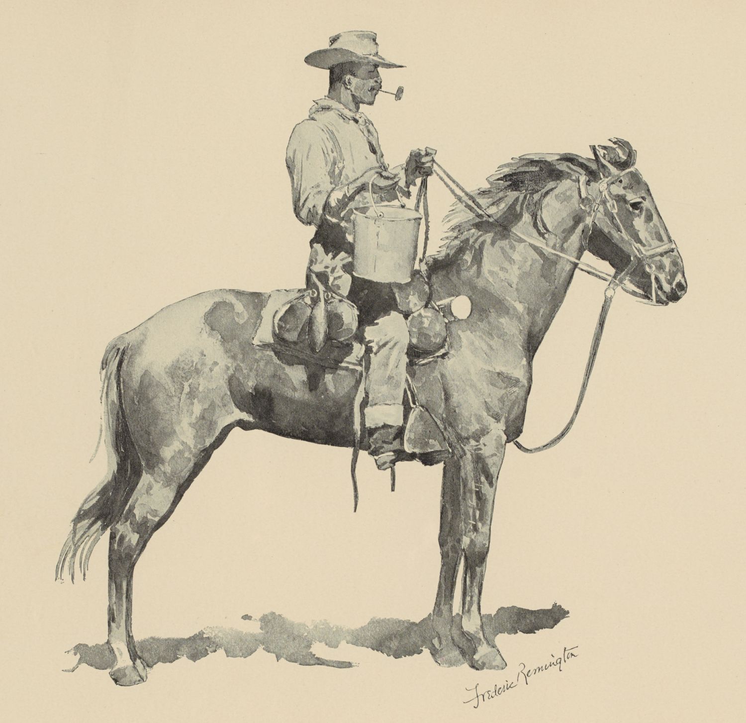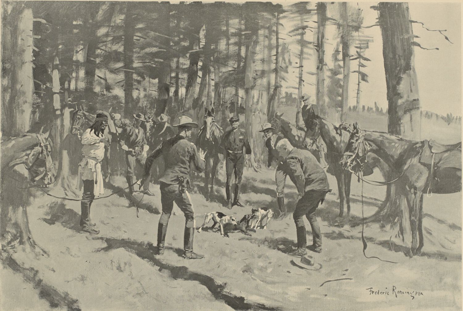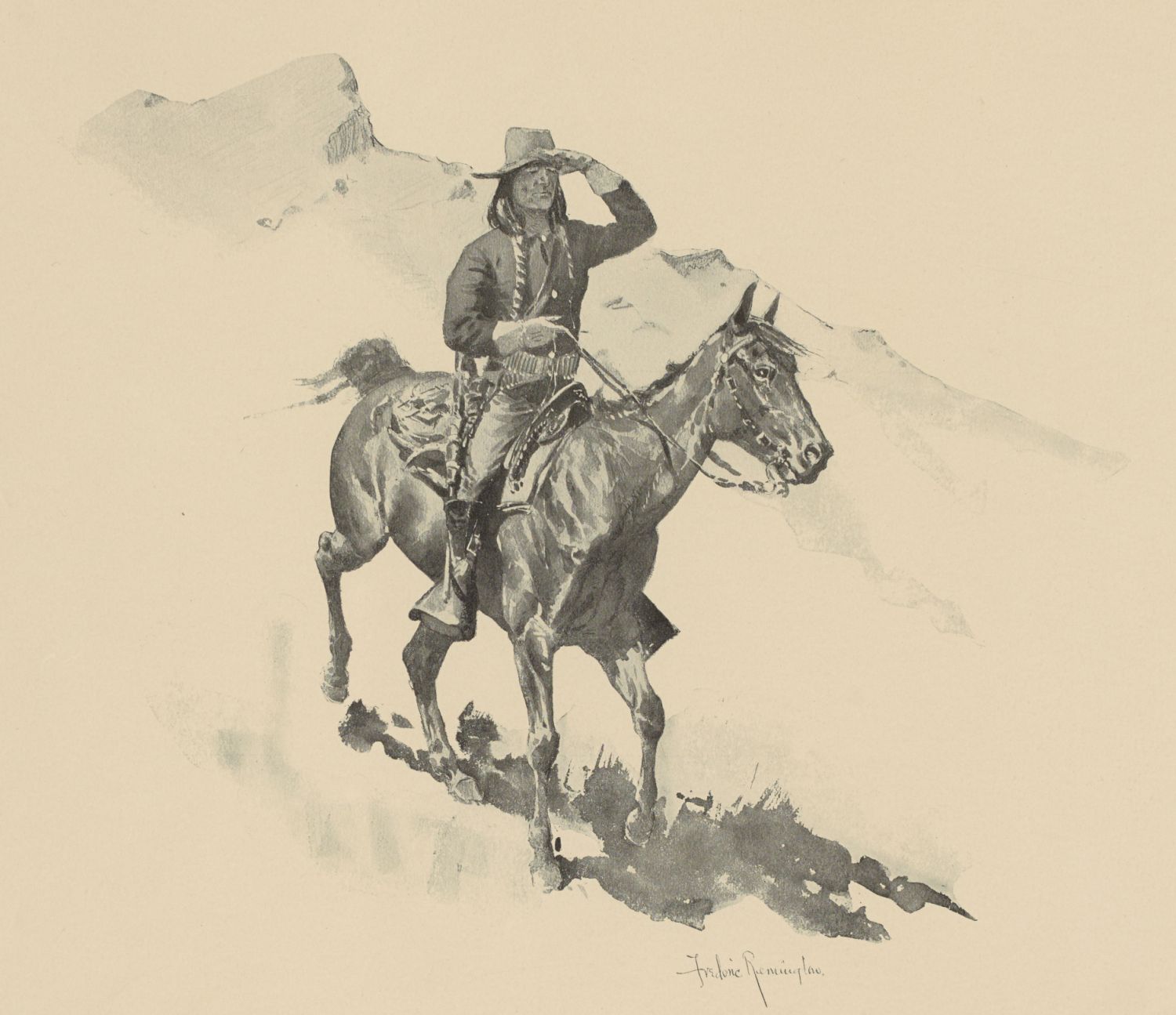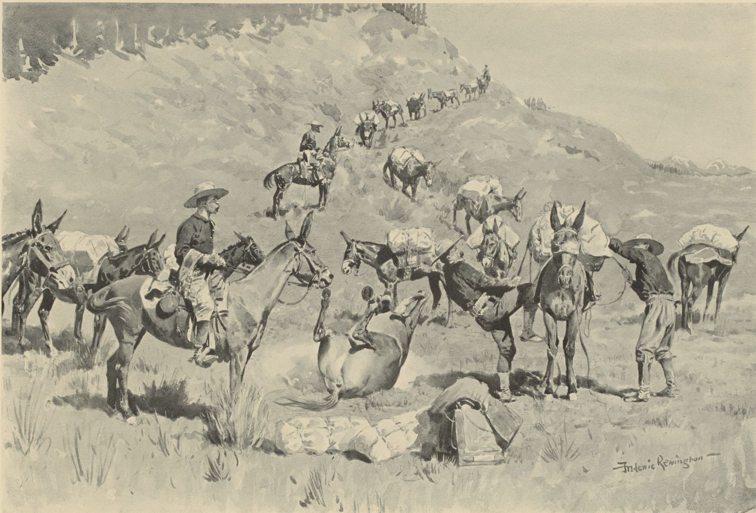 SOME time ago I was spending a driven but happy forenoon among those shops where guns, and fishing tackle, and tents, and all the various necessities of a Western holiday are found. My time was crowded, and against the column of items on my list only a few checks had been made, when I reached “Groceries.” Now, unless you have spent such forenoons and holidays yourself, the visit among the guns and fishing tackle may seem to raise questions of greater moment than any which could occur in the grocery shop. But this is not so. A man soon learns what weapons he prefers, and enters with his mind settled in advance; whereas, when it comes to evaporated vegetables, condensed soups, and pellets that can expand into a meal, you pause over each novelty, and with divided purpose wretchedly choose and unchoose until you are scarce more manlike than a woman. At least, such is my case; and having no minutes to squander this forenoon, I had pencilled my supplies to avoid discussion and temptation. Even while I was directing how I wished the parcels tied, mentioning that they were to be much jolted on the backs of horses, the shopman looked suddenly alert, and said this sounded like a camping trip. Yes, I told him in my elation, I was bound for the head waters of Wind River in Wyoming. Instantly the merchant fell from him; every trace of groceries left his expression; his eye beamed with eagerness, and he asked in the voice of one who gives the countersign, “Have you ever been to Arizona?” and hearing that I had, “I served there under Crook!” he exclaimed. Then names of the North and the South came to his lips—San Carlos, San Simon, the Gila, the Chiricahuas, the Tonto Basin, the forks of the Owyhee, Boise, Bidwell, Harney—he spoke of many familiar to me; and next we were hard at it, this old soldier and myself, exchanging enthusiasms, gossiping in comradeship among the dried prunes. Thus I wasted minutes that I could not spare, yet lost nothing by it; my parcels were put up right. And when this errand was finished, he watched me depart from the shop door, and sighed, “I should like to see it all again!”