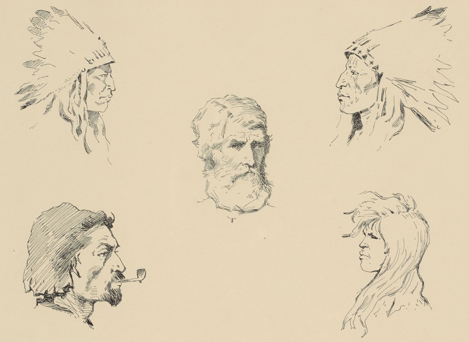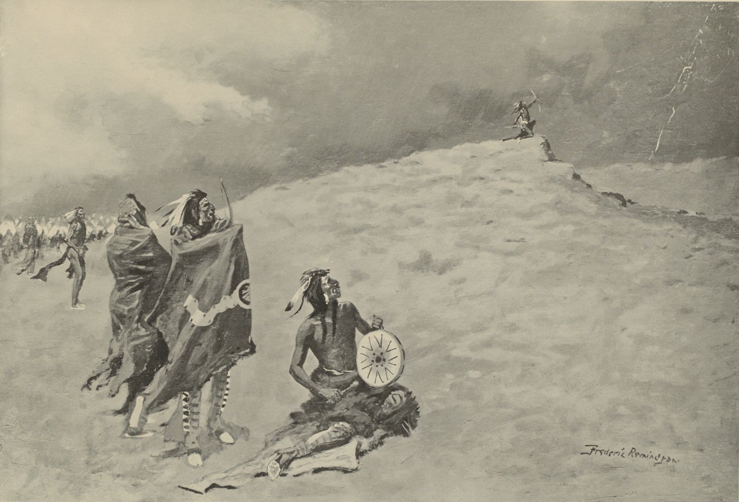 I have stood before many paintings of the West. Paintings of mountains, paintings of buffalo, paintings of Indians—the whole mystic and heroic pageant of our American soil; the only greatly romantic thing our generation has known, the last greatly romantic thing our Continent holds; indeed the poetic episode most deeply native that we possess. Long before my eyes looked upon its beautiful domain, I studied the paintings; but when Remington came with only a pencil, I forgot the rest! And now I have seen for myself, and know how he has caught alive not only the roped calf, or the troop cook sucking his comfortable corn-cob, the day-by-day facts of the wilderness, but the eternal note also, the pity and the awe of that epic life. He has made them visible by his art, and set them down as a national treasure. Look at the Pony War Dance. That wild fury of religion, that splendor of savagery clashes down to us from the Stone Age. If you will open the Old Testament where Joshua delayed the course of the sun, or they blew down a city wall with a trumpet, you will come upon the same spirit. Look at the Medicine-men and the lightning. Again man’s untamed original soul communes with a God of vengeance and terror. Is it not like Elijah and the fire-stroke from heaven upon the altar? Then turn to the Sheep-herder’s breakfast. Unless you have known that solitude, no words of mine can tell you how Remington has been a poet here. With some lines and smears on paper he has expressed that lotus mystery of the wilderness. He has taken a ragged vagrant with a frying-pan and connected him with the eternal. The dog, the pack-saddle, the ass, the dim sheep in the plain, those tender outlines of bluffs and ridges—it is Homer or the Old Testament again; time and the present world have no part here!