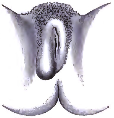 | 6. | DESCENT OF THE UTERUS, SHOWING EXCESSIVE CIRCULAR ENLARGEMENT OF THE LACERATED CERVIX, CONSEQUENT UPON REDUPLICATION OF THE VAGINAL WALLS AND OUT-ROLLING OF INTRACERVICAL TISSUES |