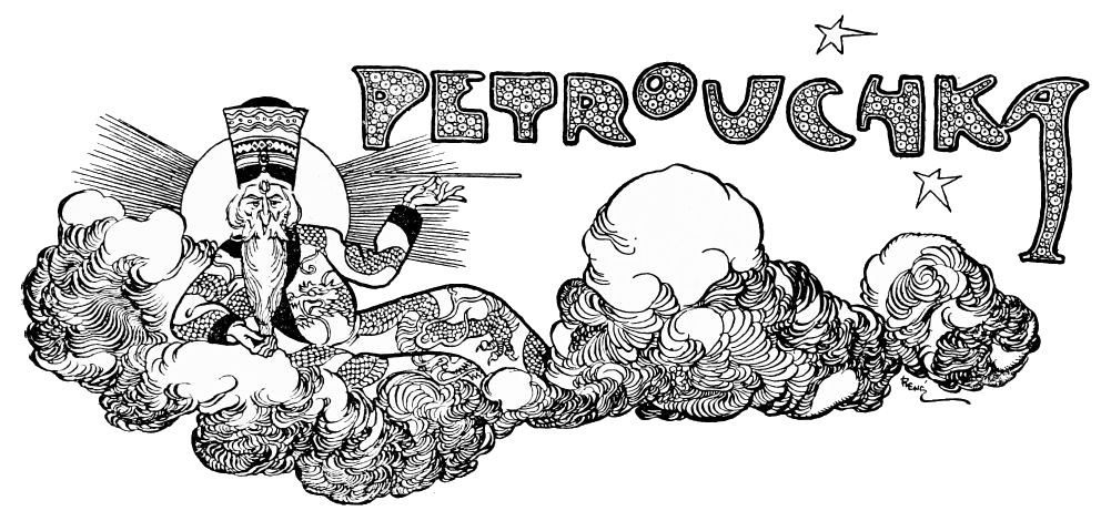 “Pétrouchka” is the joint work of MM. Igor Stravinsky and Alexandre Benois, of whom the former composed the music, while the latter designed the scenery and costumes. The restraint, the fine selective instinct, which Benois has shown in his manipulation of the wealth of material lying to his hand produces a most artistic result. The local colour is firmly, but without offending emphasis, insisted upon—that it is a Russian fair in which we find ourselves, there is no mistaking. Nor does he lack humour; nothing could be defter than the grotesque touches with which the rival puppets’ boxes are adorned, nothing more truly bizarre than the opera cloak and silk hat in which he garbs the fantastic showman for the dénouement.