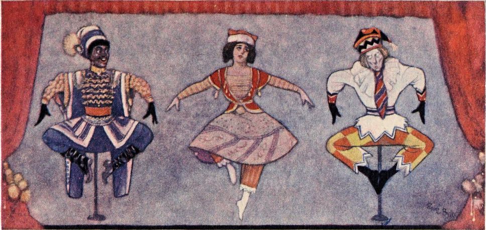 When drawn at length the curtains are, an engaging spectacle greets the eye. Propped in a row upon slender rods are three life-size puppet figures. In the middle is the Dancer, most radiant of dolls, with the pinkest of waxen cheeks and the glassiest of stares, elegantly arrayed in a striped jacket and pantaloons. On one side of her is the Blackamoor, a fierce and swarthy fellow, resplendent in green and gold, with gorgeous turban on his head; on the other, poor Pétrouchka, a grotesque figure of fun tricked out in glaring and fantastic motley.