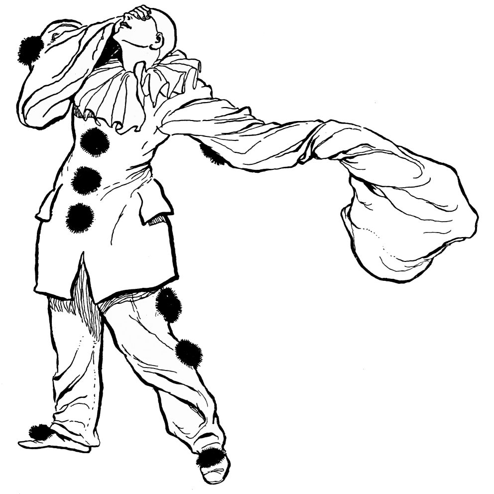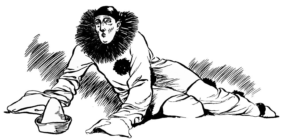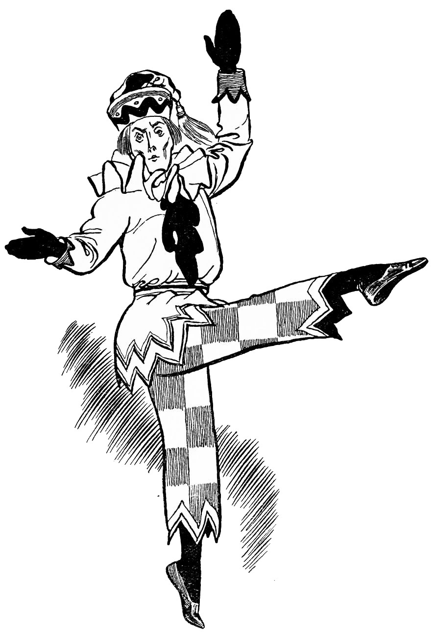 Lacking the initiative, the constructive power, which full intelligence alone can give, Pétrouchka can yet perceive his shortcomings. He passes himself in review, and finds satisfaction in{24} nothing. His motions, gestures—who could admire such awkward angularity, such jerky, jumpy movements? Thus he reflects dolefully, as he strives experimentally to move his limbs with easy grace and rhythm. As to his clothes, such gaudy, parti-coloured gear is fit only for buffoons and clownish oafs, not for one who possesses (in how limited degree, poor fellow! he does not realise) the finer instincts. His motley shames him, his involuntary gaucherie moves him to anger with himself. Nothing is right; and with a travesty of emotion which excites a smile while it moves to pity, Pétrouchka abandons himself to despair.