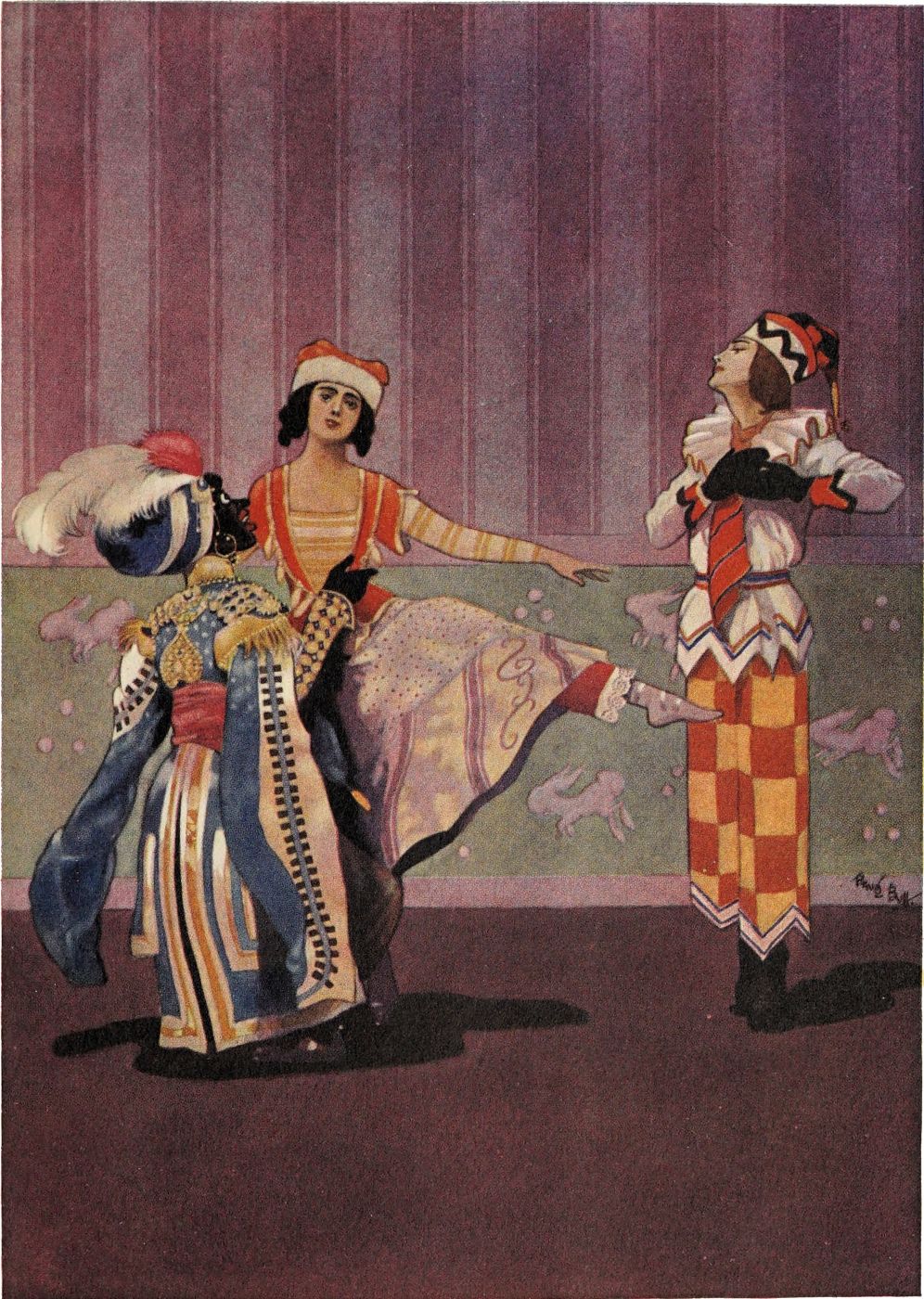 At the other end of the puppet-box, as we see when the curtain next rises, lives the Blackamoor. A more expensive puppet than Pétrouchka, despite less sensibility to the showman’s magic arts, the Blackamoor’s apartment has some pretensions to comfort. A wall-paper of violent hue and florid design (everyone who has played with a doll’s house will recognise it) serves as background to the oriental divan on which the Blackamoor reclines in luxurious ease.