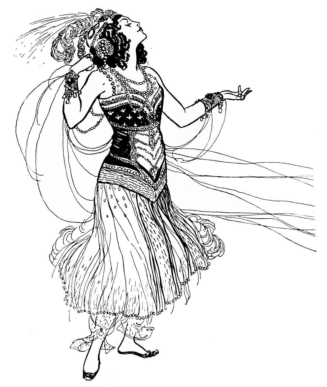 Regard Beardsley’s drawings as fashion plates, and the reader will arrive at a very fair idea of Karsavina’s appearance as Salome. Her costume is exiguous—even allowing for the lace-edged undergarment which appears round one thigh but not round the other. Her legs and arms are bare, but with a blood red heart and other devices stencilled on them. A high head-dress surmounts the tiny{220}