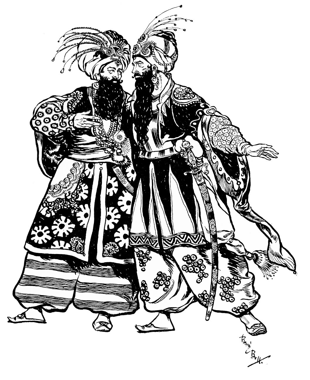 “Pure Beardsley” was the popular phrase with which the ballet was summed up on its first production. It is, of course, nothing of the sort—at least, if the phrase is to be strictly interpreted. If it were pure Beardsley the ballet would be a good deal better than it is. One has some difficulty in imagining Aubrey Beardsley staging a ballet, and probably, if such a thing had happened, the result would have been very different from that which the Russians have imagined. But even supposing that Beardsley had produced on the stage something resembling what{216} is shown us, it is perfectly certain there would have been a distinction which the present performance lacks. To put it shortly, “La Tragédie de Salome” is nothing but an aping of Beardsley, a reproduction (or shall one say, a travesty?) of certain superficial aspects of that artist’s designs, entirely uninspired by any sympathy with, or apparently even understanding of, the peculiar genius of which they were expressions.