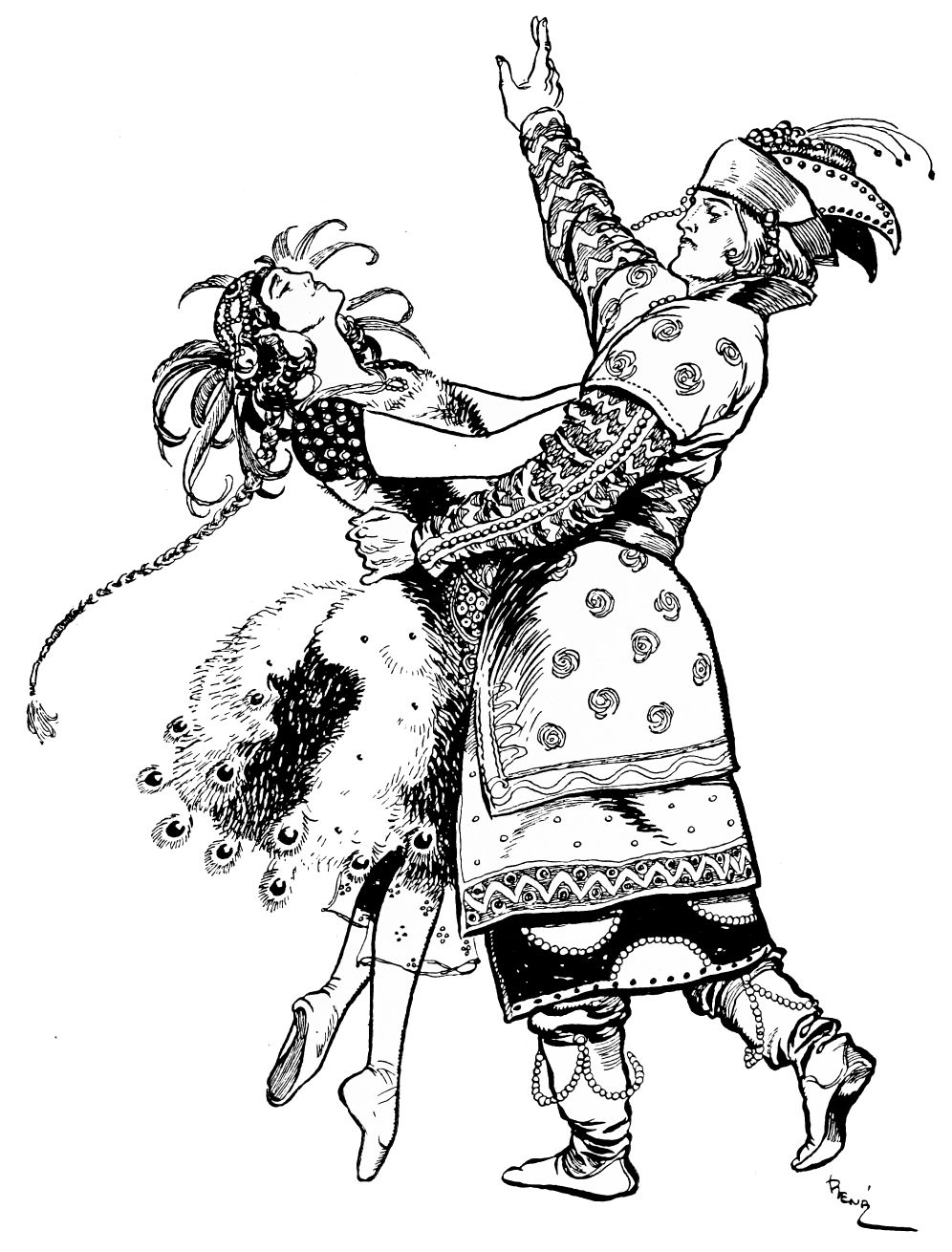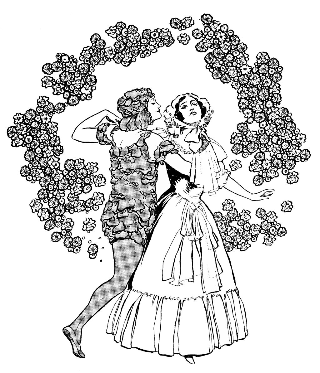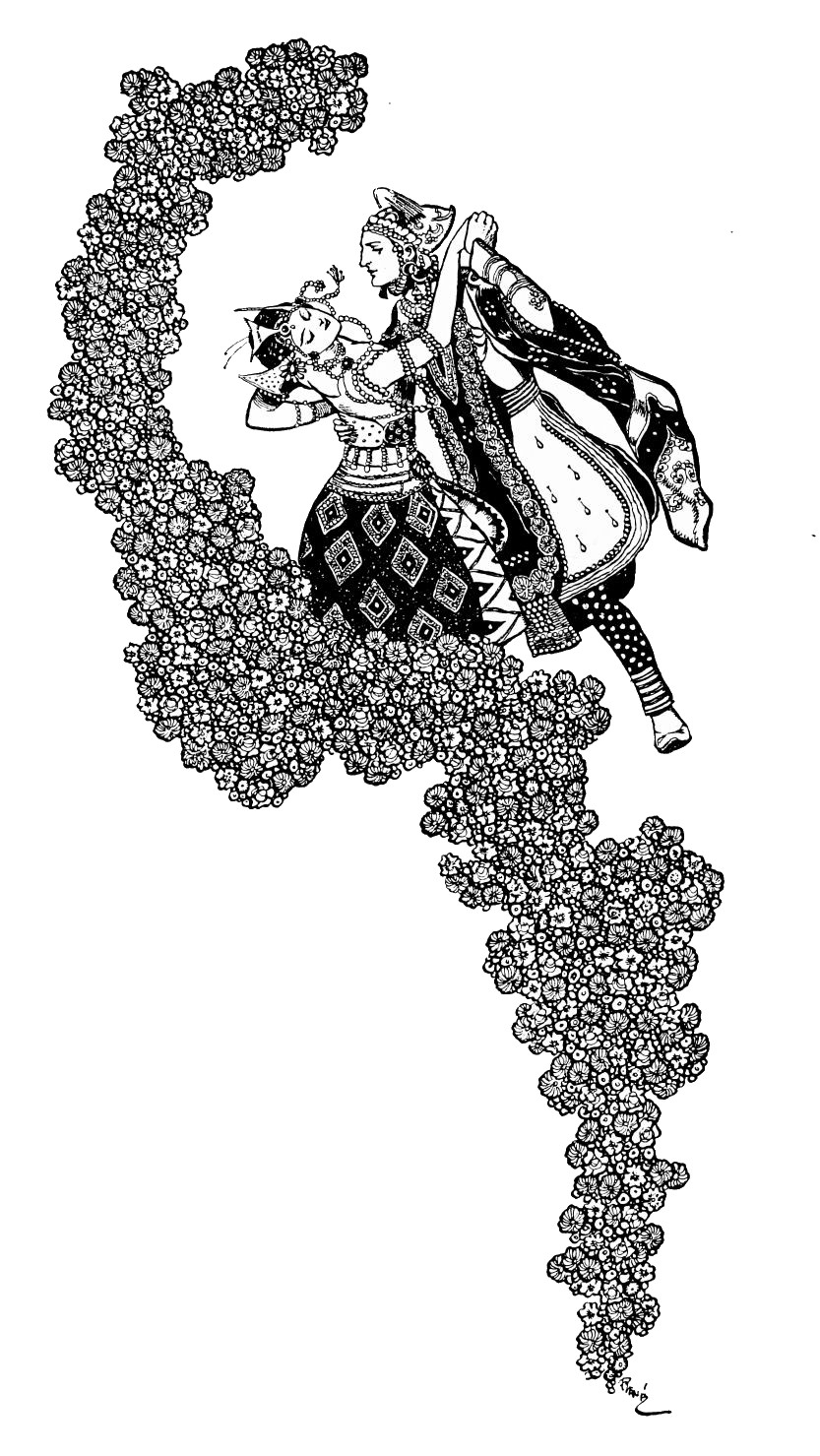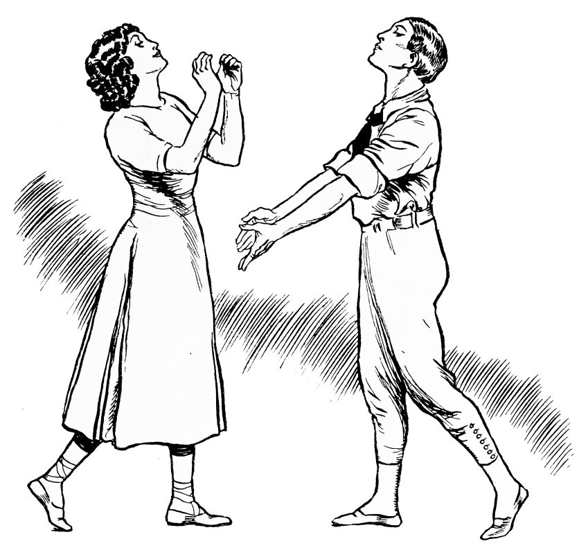 The eyes of the courtiers are turned upon him expectantly, for the Prince himself is an accomplished dancer, and the moment has arrived when he should entertain the company with his skill.{232} Fired by the ardour suppressed within him, he launches himself into a pas seul which astounds by its vigorous grace, measured agility, and brilliant daring of execution. At the very climax of his performance the beautiful stranger re-enters. Obedient to the Prince’s entreaty she dances once again; then joins him in the crowning intoxication of a pas de deux.