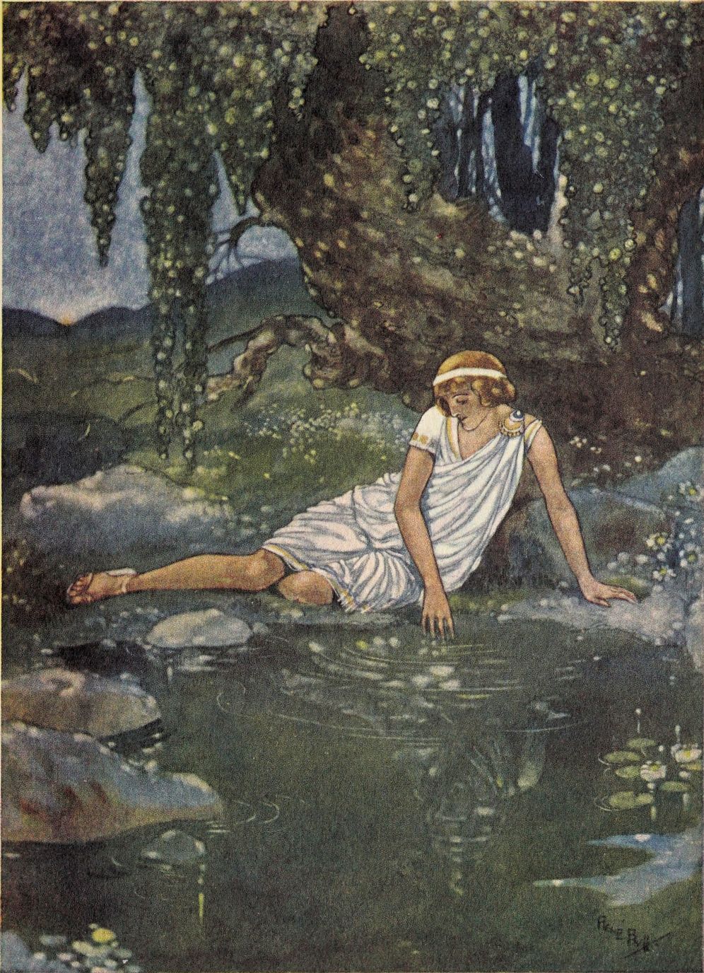 The despairing Prince bows his head in mute and helpless agony. And while he yet kneels there, a white swan glides serenely across the surface of the lake. The prince sees it, and a dreadful thought clutches his heart. As the swan nears him he looks again—and lo, about its head, so delicately poised on the slender sinuous neck, is a golden crown!
