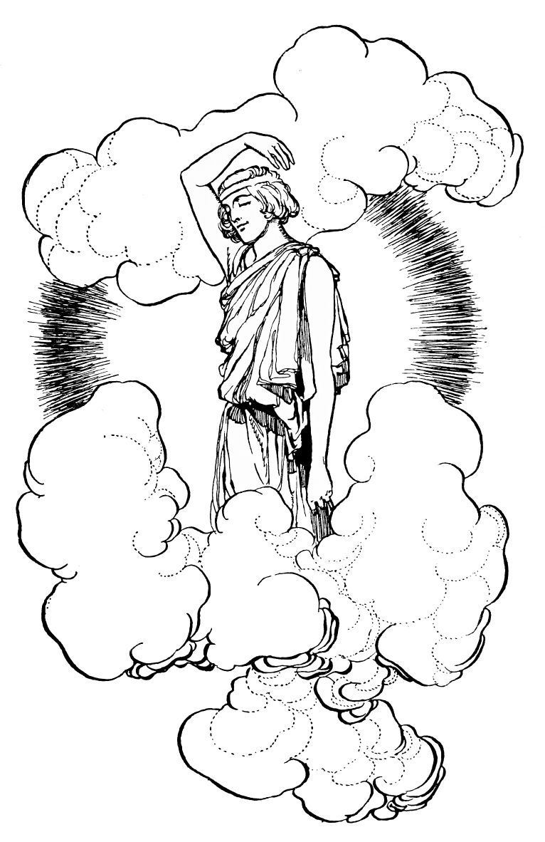 Eventually discretion overcomes the valorous curiosity of the nymphs. The last, and most attracted, flees away. The faun is{186} left disconsolate and puzzled, his slow turbid brain striving to grasp the meaning and nature of the radiant creatures that so lately stirred his appetites. Nothing remains of them save a gauzy scarf, dropped in her flight by the last, at which he stares long and stupidly. At length he picks it up, and holding it wonderingly in his hands, slowly regains his rocky perch. A mysterious influence emanates from the scarf, and yielding himself to it, the faun sinks into voluptuous dreams.