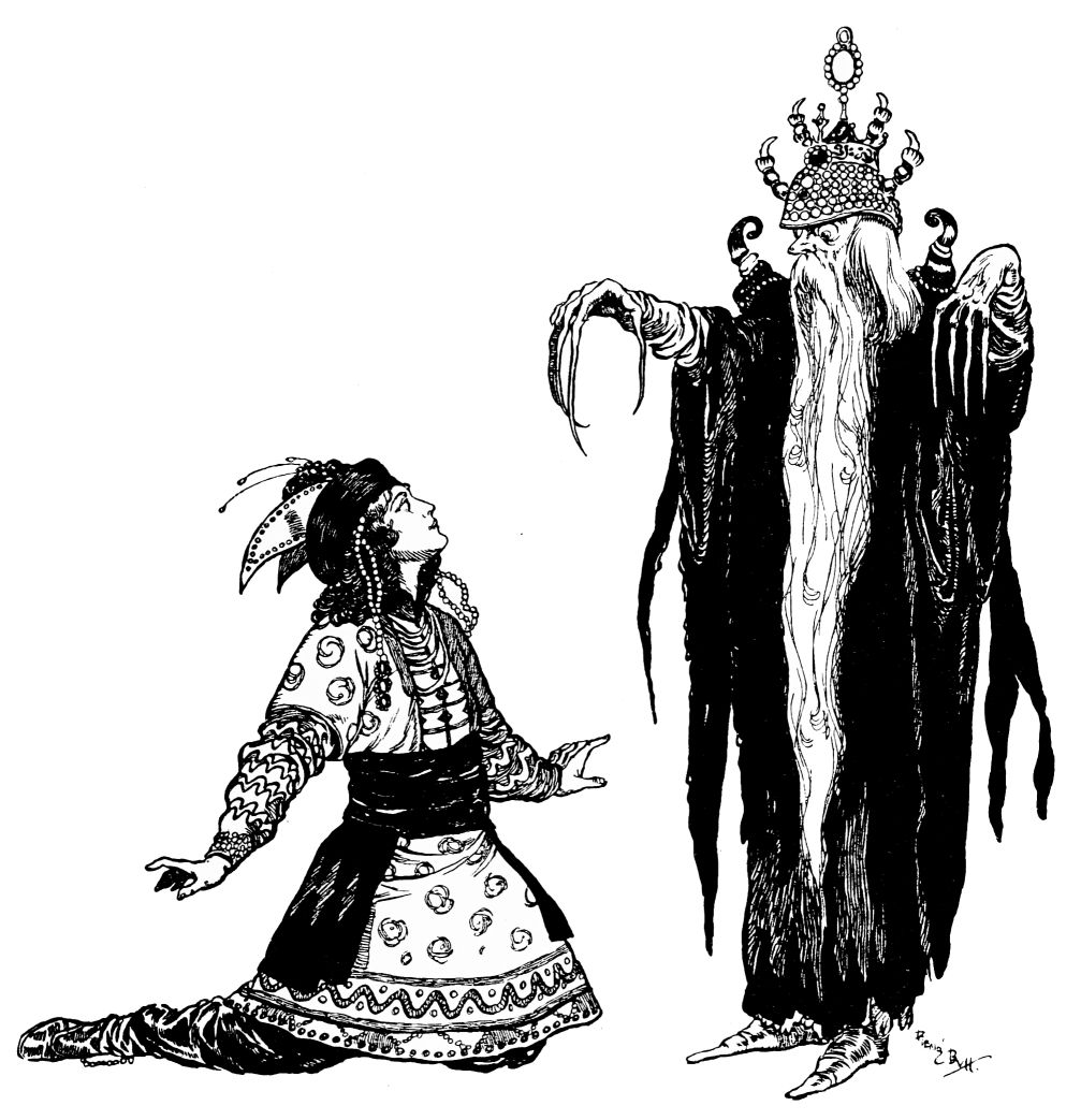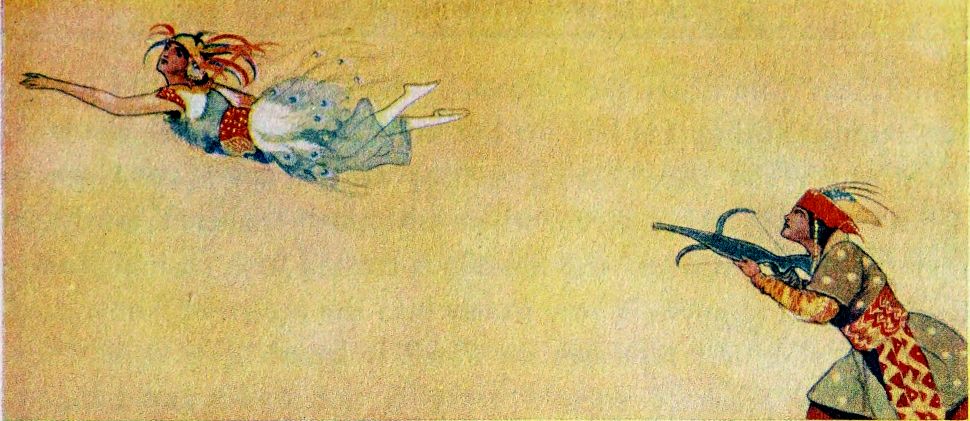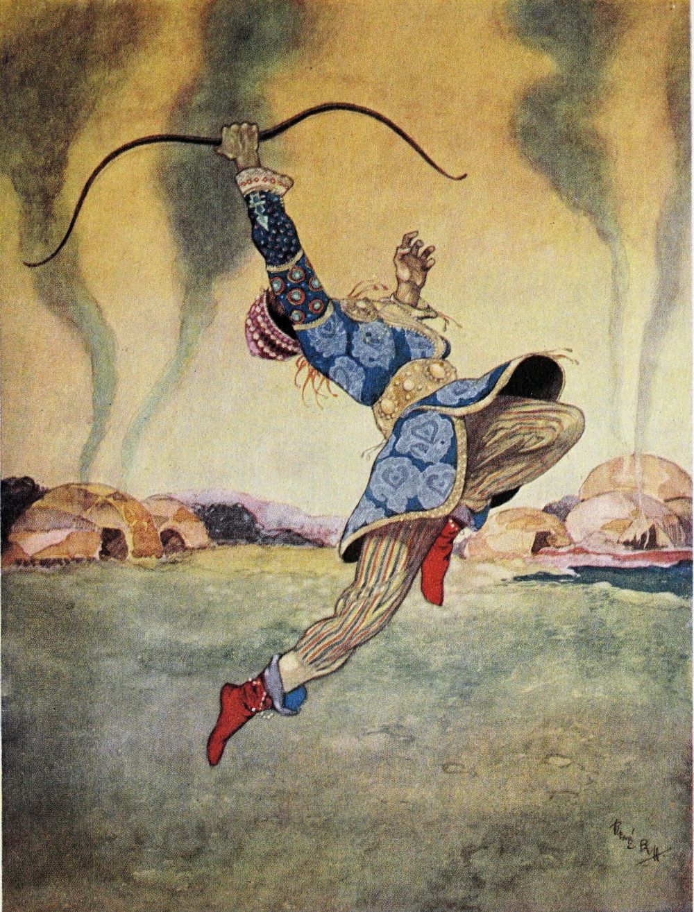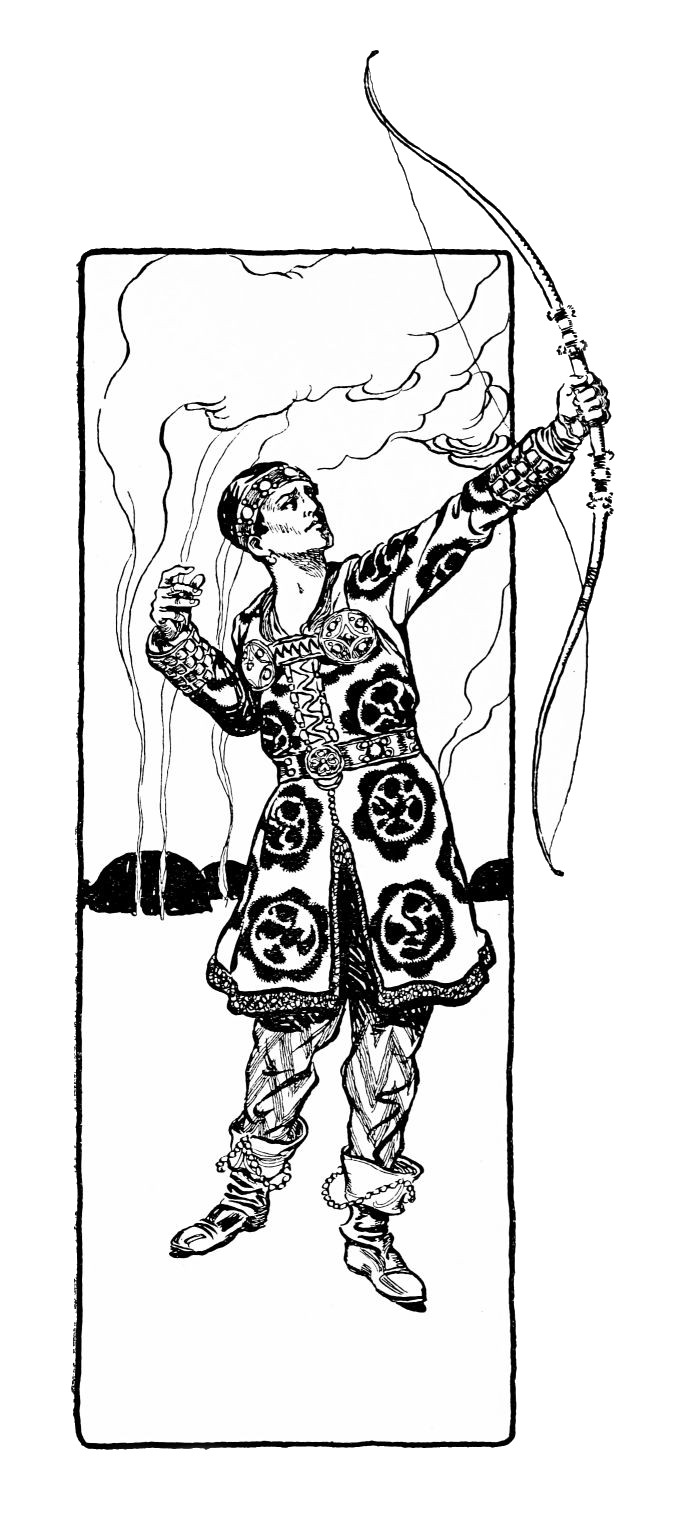 The young man lowers his weapon and turns to expostulate with his captive. Again the colloquy is interrupted, this time by the invasion of a grim, gaunt monster, which silently regards them from a mound upon which it has suddenly emerged. Again the Prince seizes his bow and strives to launch a bolt at the intruder. But he is powerless to release the trigger. The genie’s magic paralyses him. The monster recedes unharmed into the woody depths, and the Prince, perturbed by this discovery of unseen influences encompassing him, impetuously urges his captive from the scene.
