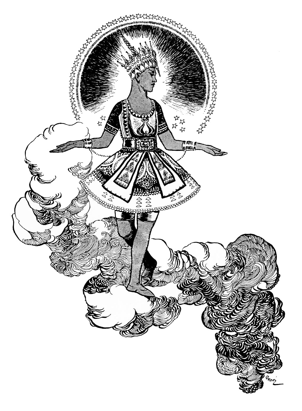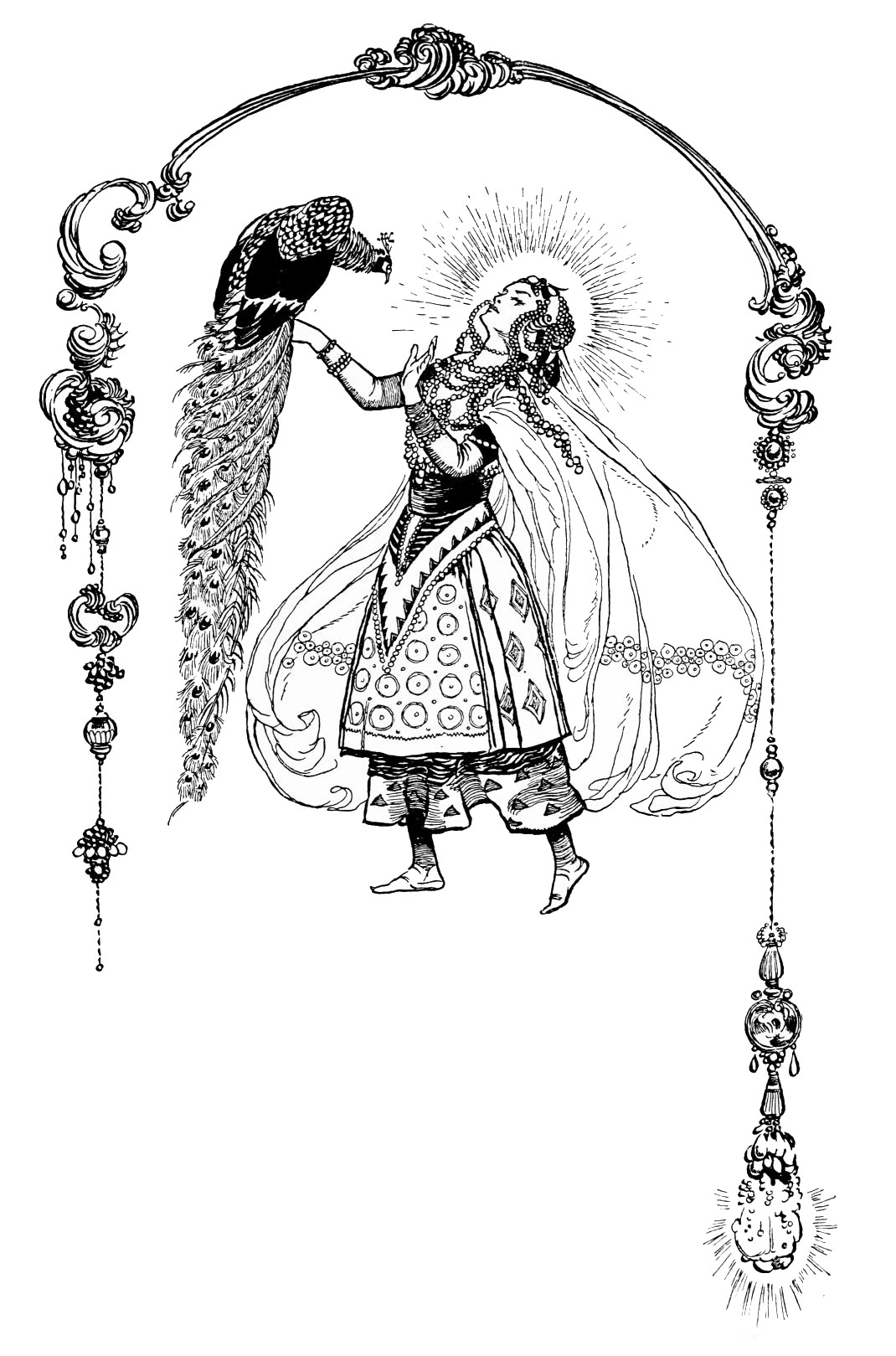 Orders are issued, but of these there scarce seems need, with such accustomed readiness do the Queen’s minions set about their tasks. Without ado the guards stationed at the doors prepare to sally forth, wrapping themselves in voluminous black cloaks. A subtle touch, those cloaks. They suggest the bleak, inhospitable wilderness without, emphasising the warmth and luxury of the brilliant scene within—an emphasis which is enhanced by the decorative value, considering the scene pictorially, of the black irregular masses which the shrouded high-capped figures present against the general riot of colour. When presently the stranger is led in, likewise cloaked and muffled, that contrast is again insisted upon. The stranger, it is instantly apparent, is travel-weary: one divines the curiosity and wonder with which he finds himself led into an atmosphere of ease and luxury which his tired senses, despite the bandage over his eyes, must gratefully apprehend.