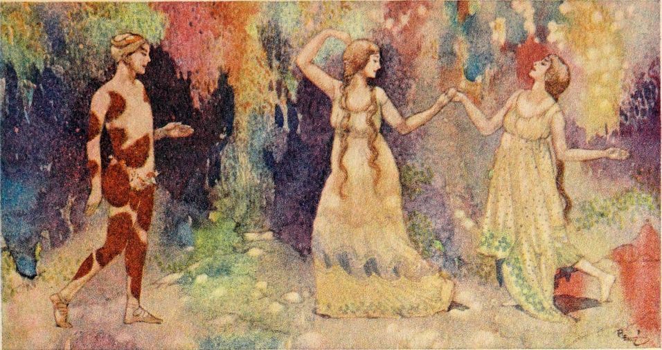 The keen animal senses of the faun detect some strange presence near at hand, and peering from his coign of vantage he perceives the nymphs. Such beings are beyond his ken, but the sight of them awakens a vague interest. He yields to a subtle attraction, and descending from his perch approaches the intruders.{185}