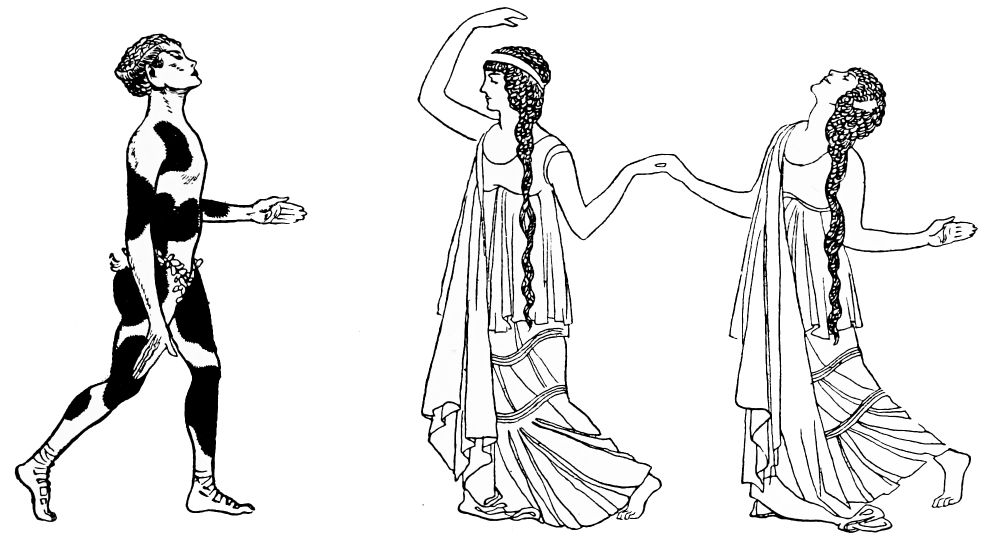 The theatrical ballet is comparatively a modern institution, but its real origin is to be found in the customs of very early times. The antiquity of dancing as a means of expression is well known, of course, and concerted movements on the part of a number of dancers, which constitute the ballet in its simplest form, are recognised to have been a feature of religious ceremonial in the furthest historic eras. The evolutions of the Greek chorus occur at once to the mind, and there is evidence that among the Egyptians, Assyrians, and Phœnicians, the formal dance was a part of religious ritual. Representations occur, on early vases and other relics, of dancers revolving round a central person or object, standing for the sun, and it may reasonably be surmised that some such ceremonial occurred among the most primitive pagan peoples.{2}
