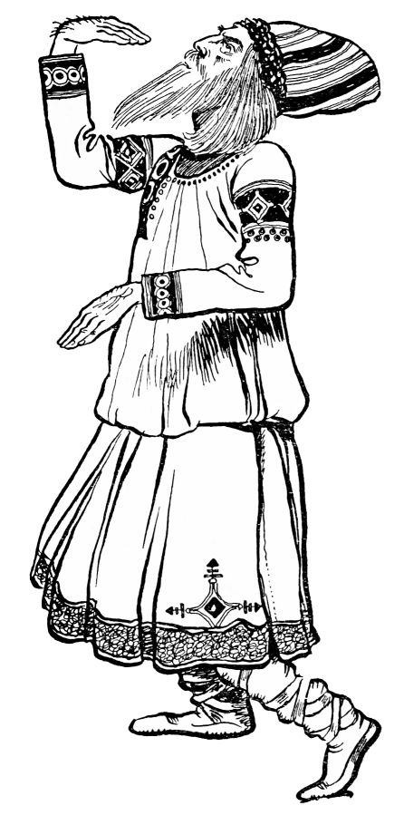 After the games have been in progress for some time there enters a procession of elders of this primitive tribe, escorting an old man with a long beard—the Sire of all the Sages, high priest and venerable interpreter of the omens. His entry is a signal for everyone present to be seized with a violent tremor, which sets each figure quivering like an agitated table jelly. With due form{204} and ceremony the ancient one pronounces a blessing on the Earth’s unfailing fruitfulness, accomplishing this act by spreadeagling himself, with the aid of assiduous helpers, face-downwards in the middle of the stage. If only the happy thought had occurred to M. Nijinsky to have the beard of the venerable one pulled forward the latter would have presented a very interesting travesty of a starfish.